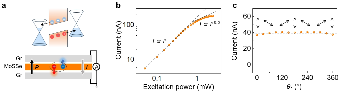 Fig. 2︱Depolarization field-dominated photocurrent generation in the MoSSe devices. a, Schematic of the band alignment (top) and the photocarrier transfer process (both electron and holes) in the device (bottom). The existing depolarization field drives the photocarriers to the interface and leads to a photocurrent (grey arrow) in the direction opposite to the polarization direction (black arrow). b, Excitation power-dependent spontaneous photocurrent. The logarithmic coordinates are used in the figure representation. The dots are the experimental data and the dashed line corresponds to a linear fit. c, Linear polarization direction dependence of the photocurrent by varying the angle ( ) of the waveplates. The horizontal dashed lines are used for eye guidance.