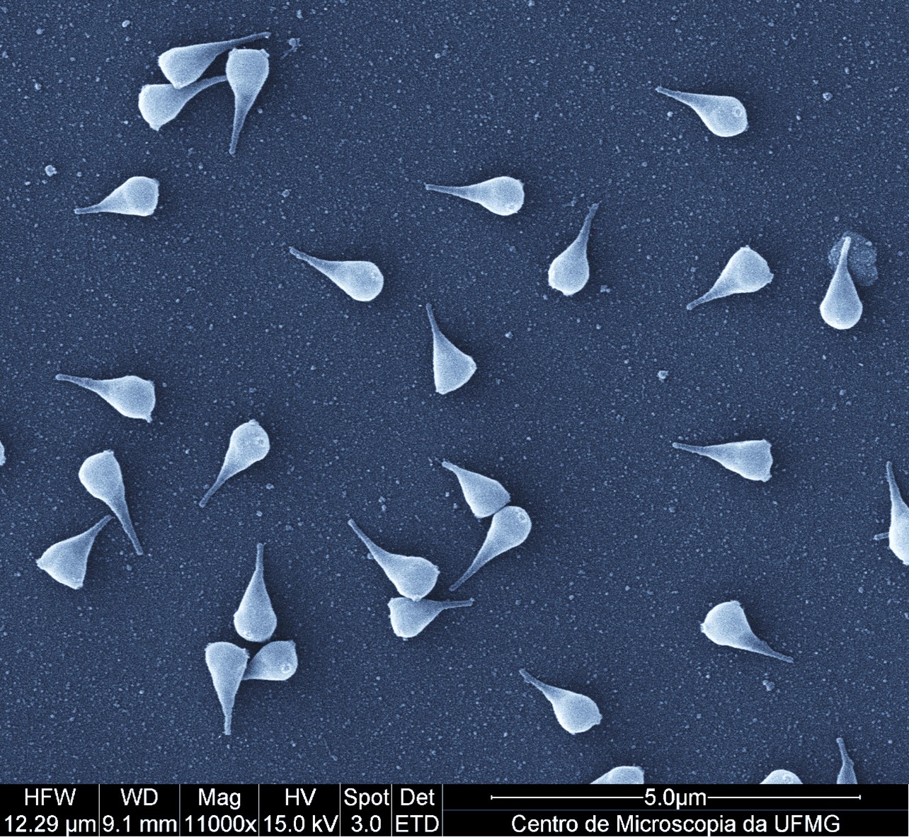 Scanning electron microscopy of Naiavirus particles observed during the first microscopy session at the end of 2024. Centro de Microscopia, UFMG.