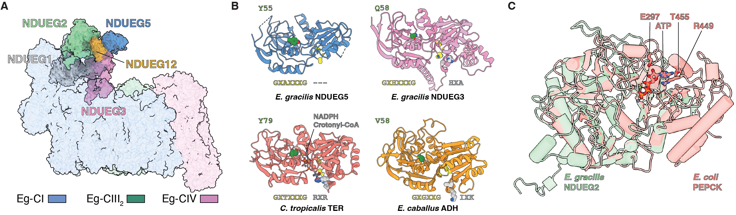 Another interesting point of E. gracilis’s ETC is that a ‘fatty acid synthesis (FAS)’ domain is found located on the very tip of Eg-CI PA (Figure 2A). This FAS domain has already been identified by mass spectroscopy-based study of Eg-ETC and located to CI PA via negative stain electron microscopy6. Our study provides the first high resolution picture of such domain and identified its five component subunits. Sequence and structural BLASTs reveal that these subunits are homologous to enzymes involved in the reversal process of fatty acid b-oxidation, in particular the NADH-dependent trans-2-enoyl-coenzyme A (CoA)/acyl carrier protein (ACP) reductases that convert 2-enoyl-CoA/ACP to its saturated form (Figure 2B). Another subunit in the Eg-FAS domain is structurally homologous to phosphoenolpyruvate carboxykinase (PEPCK) (Figure 2C), which may also contribute to the fatty acid synthesis/wax fermentation process of E. gracilis by supplying its precursor, malonyl-CoA, via fumarate and the anaerobic ETC CI-rhodoquinone-CII. However, despite thorough activity assay efforts, none of these FAS subunits has the activity of their homologous FAS enzymes. Such phenomenon is not unexpected in the field of ETC, since the previously reported g-carbonic anhydrase domain of non-opisthokont CIs, the short-chain dehydrogenase (SDR) homologous subunit NDUFA9 and the nucleoside kinase subunit NDUFA10 of mammalian CI are all either not active or cannot proven to be active3,7.