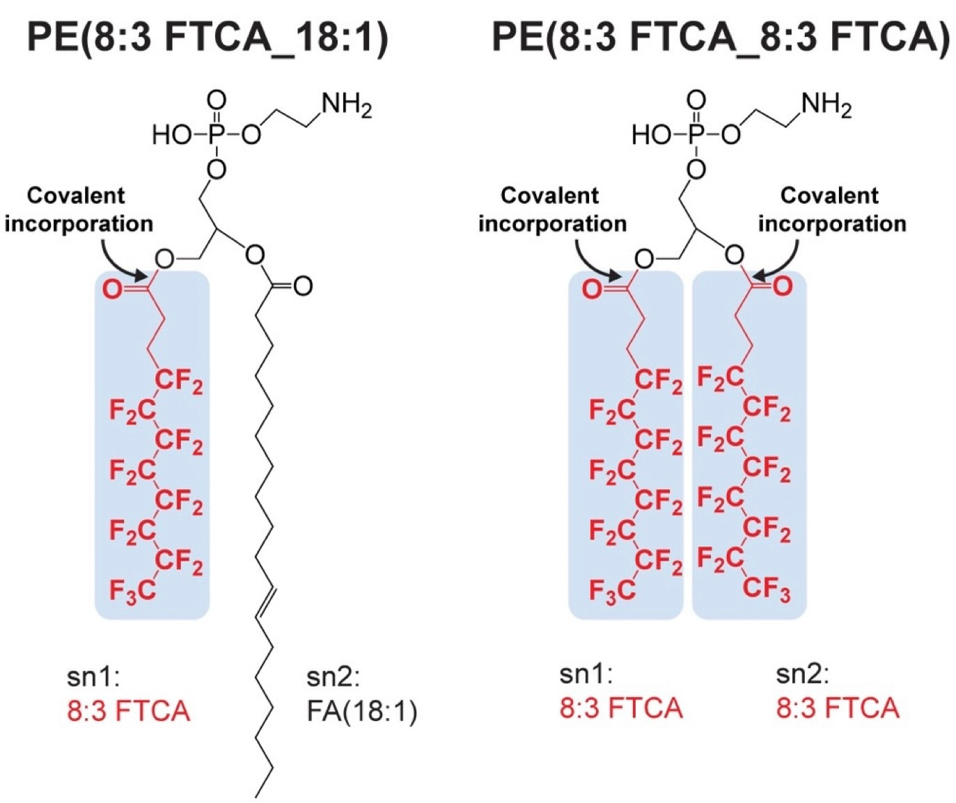 n:3 FTCAs are polyfluorinated fatty acids, and the enzymes bacteria utilize to synthesize glycerophospholipids apparently do not discriminate between polyfluorinated and non-fluorinated fatty acids. Using Pseudomonas sp. strain 273 genome information and protein expression data, we identified putative genes and proteins involved in the covalent incorporation of n:3 FTCAs into the glycerophospholipid pool, which could potentially serve as biomarkers for this incorporation process. Notably, covalent incorporation of n:3 FTCAs is fundamentally distinct from partitioning of PFASs into lipid bilayers 3. The physicochemical properties allow PFASs to reversibly associate with lipid bilayers, a process based on hydrophobic interactions and van der Waals forces that does not involve covalent bond and fluoromembrane formation.