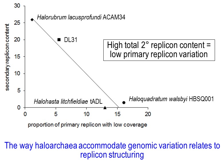 Because the work involved a very detailed analysis of genomic content and variation through to a comparative assessment of communities across disparate lake systems, the types of outcomes realized from the study were quite varied. For example, Bernhard found that the way that haloarchaea accommodate genomic variation relates to replicon structuring (image 2). Different species of haloarchaea have one replicon (chromosome) or multiple replicons (one large primary replicon and one or more secondary replicons). Bernhard determined that haloarchaea which have a high proportion of their genome contained in secondary replicons have a proportionately lower content of genomic variation in their primary replicon (and vice versa).