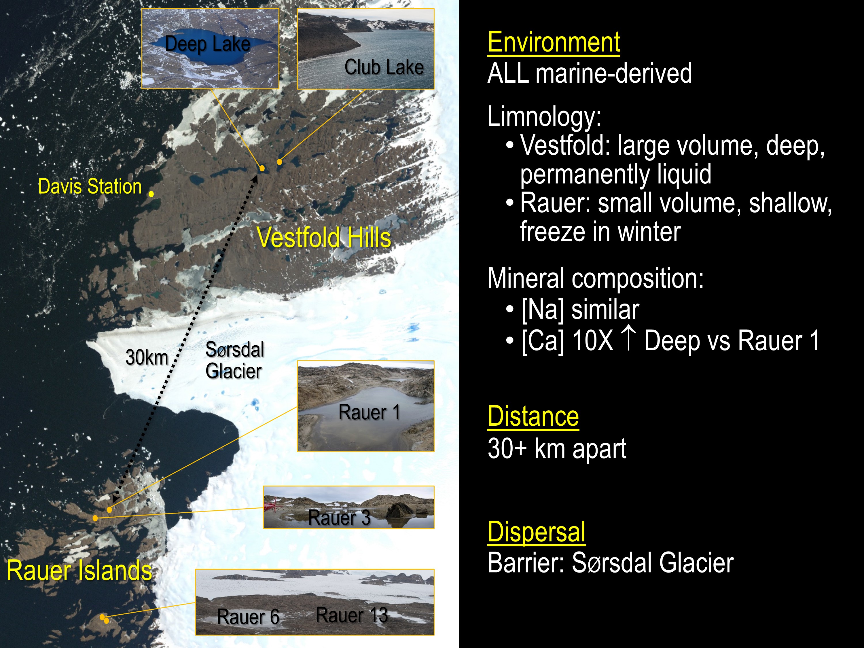 This indicates that these species are overall endemic to the Vestfold Hills-Rauer Islands and may very well be endemic to Antarctica. Very little is known about the endemism of Antarctic microorganisms (Cavicchioli Nat Rev Microbiol 2015): do regional distinctions occur (i.e. between the 16 distinct ice-free regions)?; does Antarctica have its own ‘total microbial pan-genome’ that varies to the rest of the world?; what does the extent of endemism mean for species invasion? – will the Antarctic populations be susceptible to alien species and hence ecosystem function become irrevocably perturbed? – one of our earlier studies suggests this could be the case for viral invasion of keystone bacterial species in Ace Lake (Lauro et al ISMEJ 2011).
