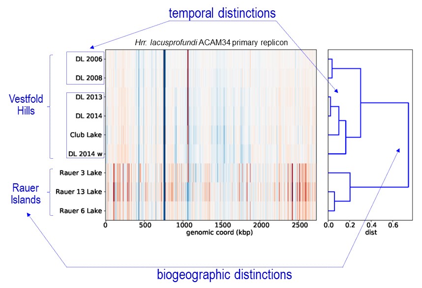 The analysis of strain variation formed the last chapter of Bernhard Tschitschko’s PhD studies. His analysis coincided with data beginning to churn out from our JGI Community Science Program that was (and still is) producing metagenome data from samples taken during a major 2013-2015 over-wintering expedition along with some others samples from 2006 and 2008. As a result, Bernhard and others (from my group, JGI and UTS) were able to analyse metagenome data generated from four hypersaline Rauer Island lakes (Rauer 1, 3, 6 and 13), Club Lake (which neighbours Deep Lake) and a Deep Lake time series (2006, 2008, 2013-2014). This enabled assessments of population level genomic variation including the prevalence of strain specific genomic markers, and biogeographic patterns of genome evolution.