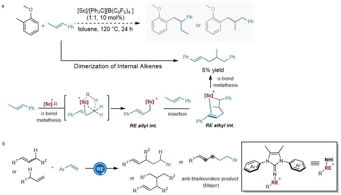 Figure 2. The allylic C-H functionalization of simple alkenes. a preliminary results on the reaction of 2-methylanisoles with β-methylstyrenes. b Rare-earth mediated direct hydroallylation of styrene derivatives with 1-aryl-2-alkyl alkenes and a-alkenes. Rare-earth (RE).