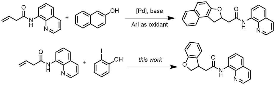 My first research project was revisiting a [3+2] annulation reaction between alkenyl amides and 2-naphthol (as of yet unpublished) that was first discovered by a former graduate student Zhen Liu and undergraduate student Tian Zeng in our lab. One limitation of this reaction in its current state of development is that it requires an excess amounts of bystanding oxidant, and the only oxidants that are effective are aryl iodides; this makes the reaction less useful due to inevitable side reactions, not to mention concerns about atom economy. Nevertheless, I was inspired by this reaction, and I came up with a question: could 2-iodophenol be used as an all-in-one coupling partner and oxidant? To our surprise and delight, the first reaction I tried was a big success, and around 70% yield of the desired product was obtained.