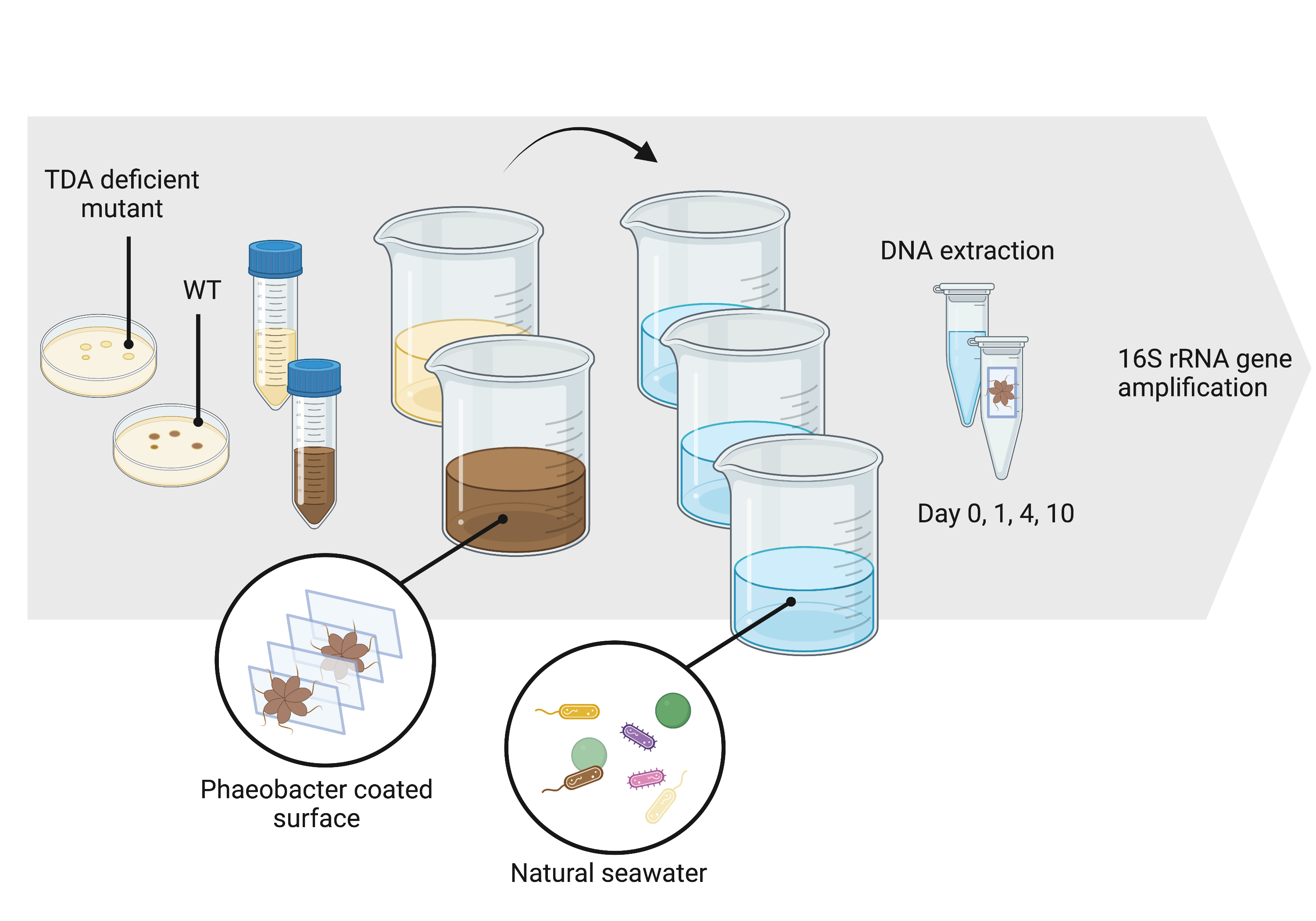 Amplicon sequencing of the 16S rRNA V3-V4 gene region was used to assess differences in the microbial community composition during the microbial community succession forming on top of the biofilm of the TDA-producing wild type and the TDA deficient mutant, respectively. Having studied the antibiotic effects of P. inhibens and its ability to eliminate fish pathogens in aquaculture, we expected that the potential of P. inhibens to produce TDA would strongly affect both biofilm and the surrounding planktonic community assembly patterns. In particular, we expected reduction or even elimination of genera known to be susceptible to TDA in the microbiome associated with the wild type.
