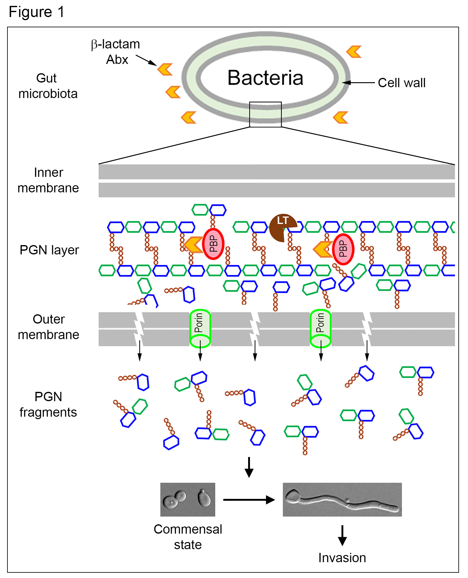 An important clinical risk factor for invasive C. albicans infection is the use of Abx. However, the reasons behind it were not clear. A clue emerged from a report that β-lactam Abx causes the malfunctioning of PGN biosynthetic machinery, churning out large quantities of PGN subunits (3), whose structures highly resemble to those we previously identified to be active in triggering C. albicans hyphal growth (2). This enlightening connection led us to hypothesize that treatment with β-lactam Abx would cause the trillions of gut bacteria to release a massive amount of PGN subunits, which could promote C. albicans hyphal growth to penetrate mucosal barriers, leading to tissue invasion (Figure 1).