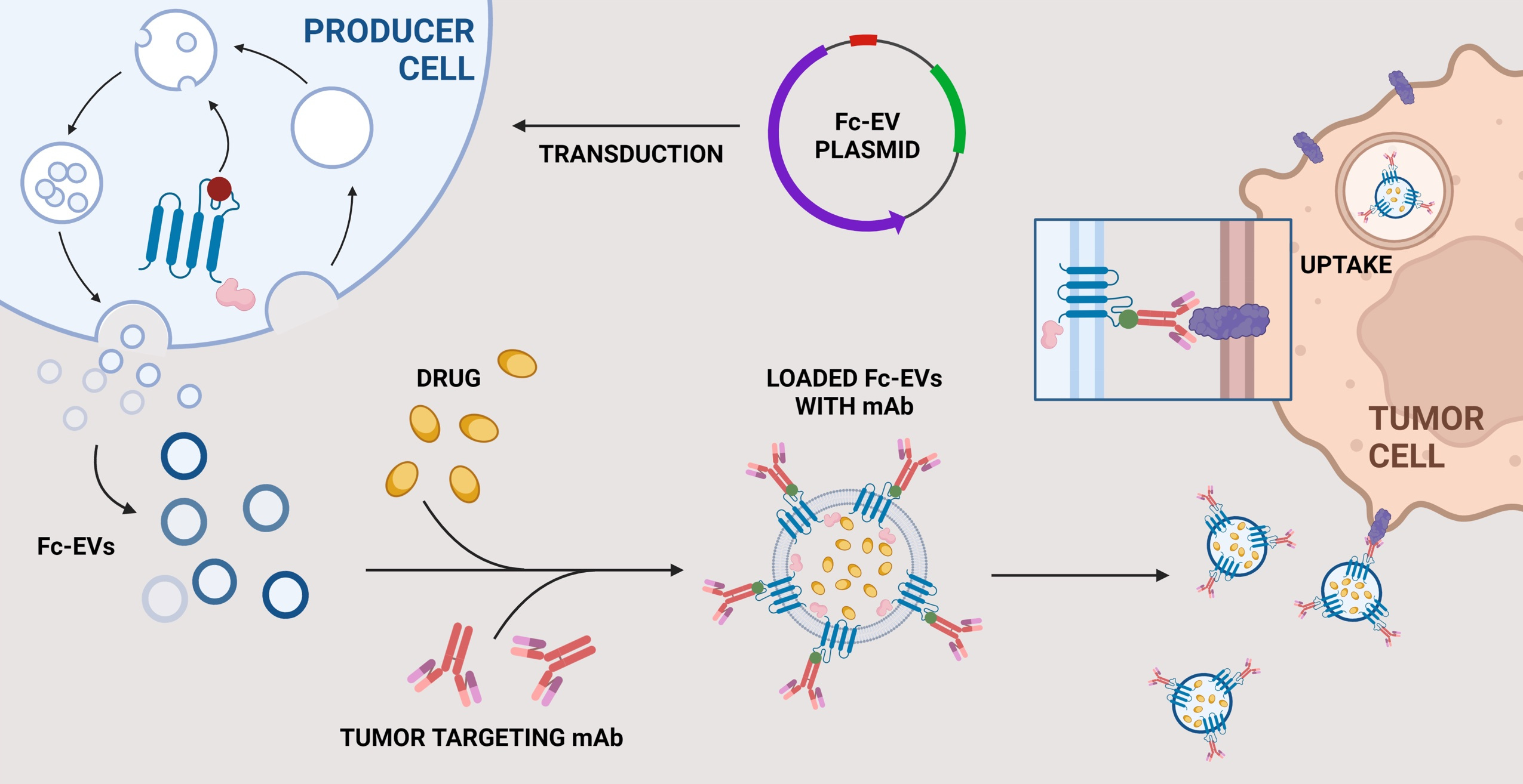 EVs are increasingly being investigated as promising biotherapeutics owing to their potential as a natural delivery vector that can transport macromolecular content and surpass biological barriers to the site of interest. EVs are associated with minimal toxicity and improved drug potency, with enhanced tumour penetrance, and retention in tumour cells. EVs can be bioengineer to express targeting moieties, which we and others have reported previously. Here, the aim was to develop a versatile system by displaying antibodies. Our hypothesis was that this would be beneficial compared to conventional EV targeting systems as the antibodies here can be interchanged depending on the intended target, thereby offering the potential to utilize Fc-EVs as an off-the-shelf modular drug that can be combined with previously approved therapeutic antibodies.
