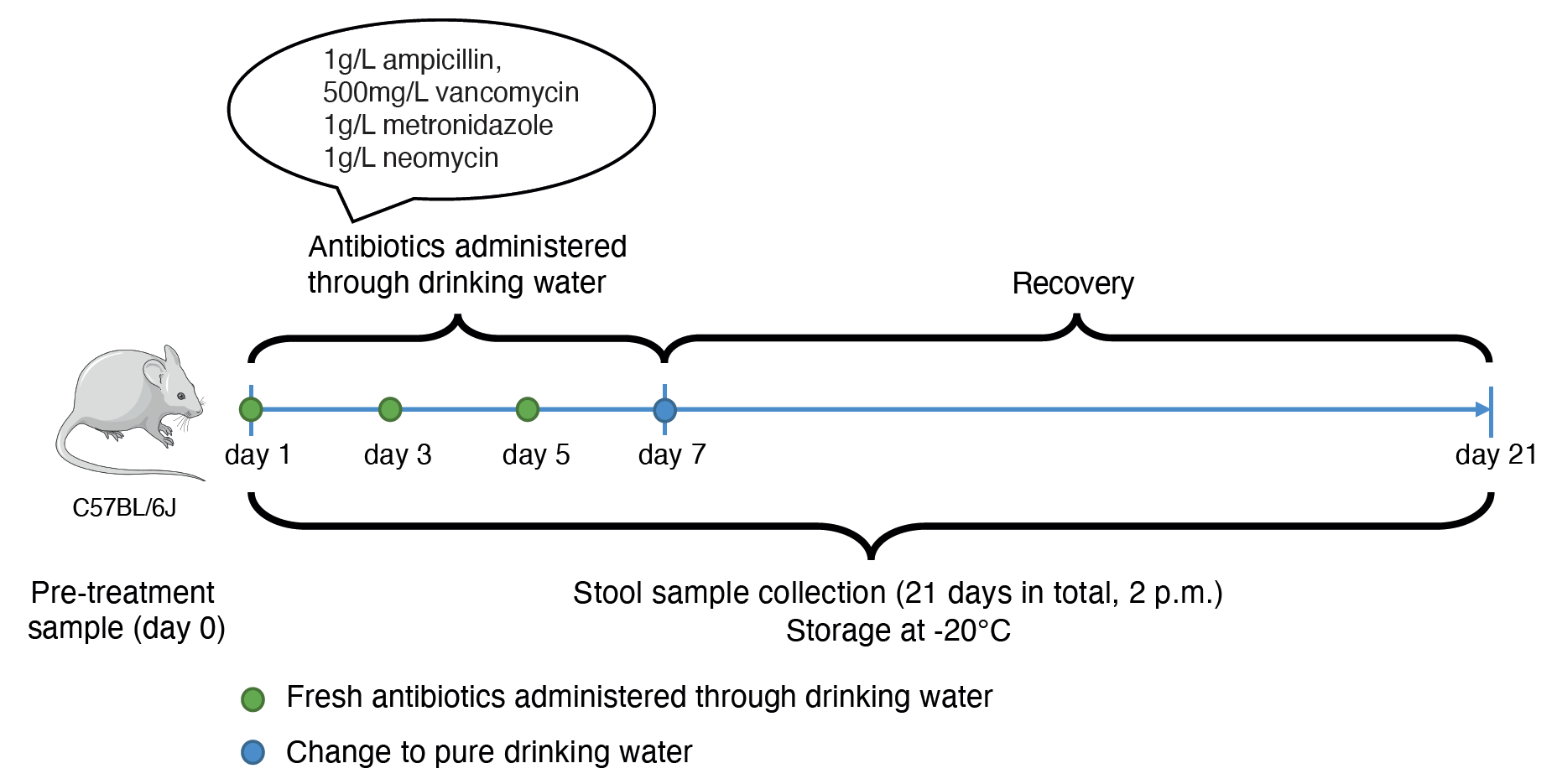 Figure 2: Longitudinal experimental design. Longitudinal fecal samples were collected from antibiotic-treated and untreated mice to assess the evolution of the resistome.