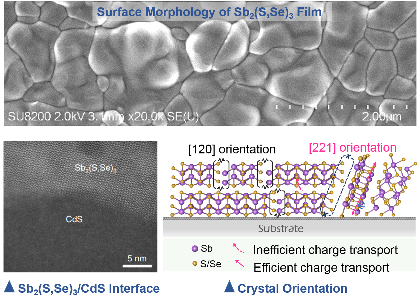 Sb2(S,Se)3 is a kind of emerging solar material with simple composition, high stability as well as abundant elemental storage. The crystal structure is composed of (Sb4S(e)6)n ribbons (Fig. 1a). Sulfur and selenium are completely miscible, which enables the band gap tunable in 1.1-1.7 eV range, falling into the optimum band gap estimated by Shockley-Queisser limit.