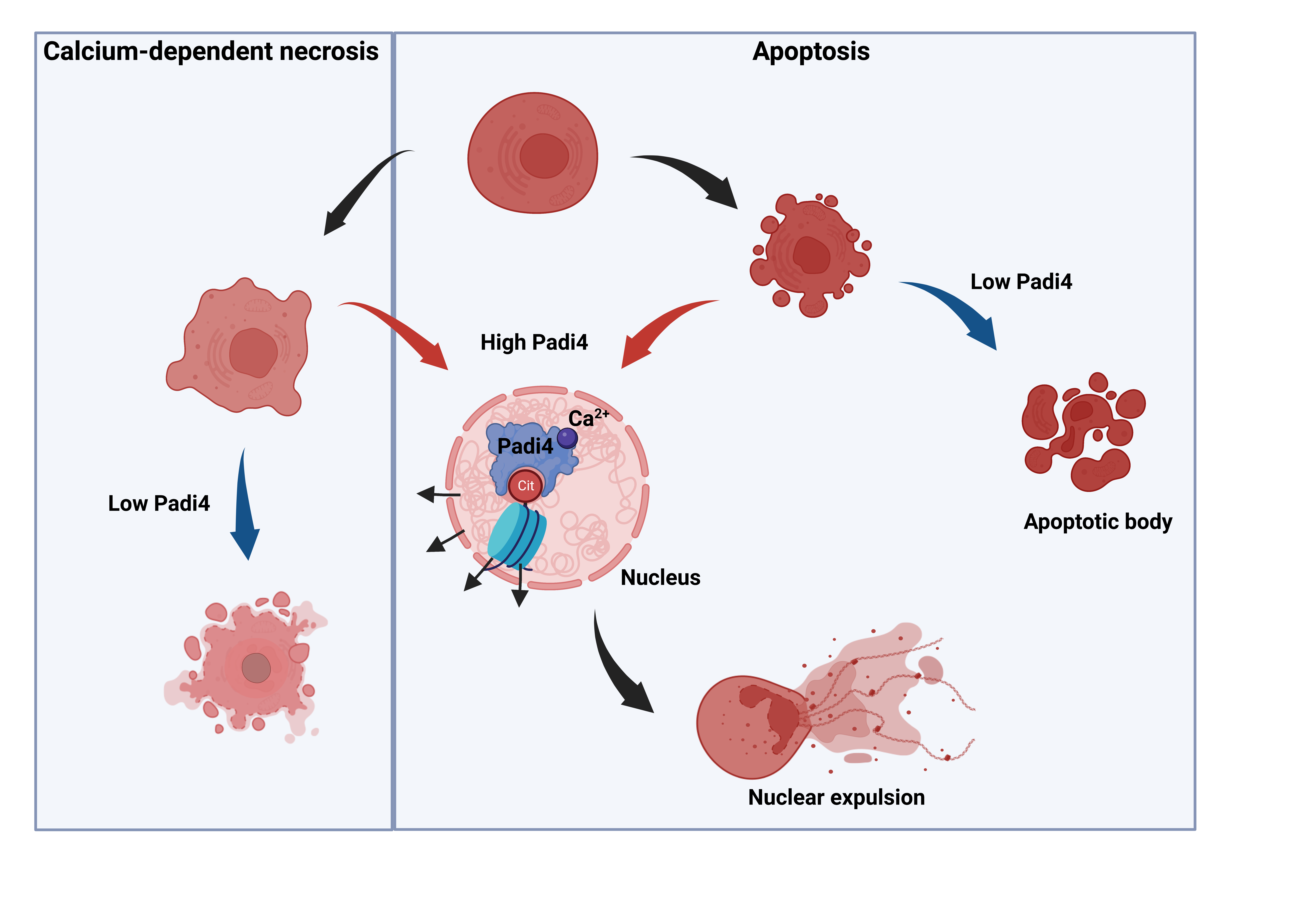 In this study, we report that tumor cells exhibit an altered apoptotic program characterized by nuclear expulsion and citrullinated chromatin which enhances metastatic outgrowth in the lungs in a Padi4-dependent manner. Through single cell tracking, we uncovered that the occurrence of a calcium spike during apoptosis serves as a trigger for the activation of Padi4. This activation subsequently results in the swift de-condensation of chromatin, with a driving force to explode the nucleus and generation of nuclear expulsion products (NEPs).