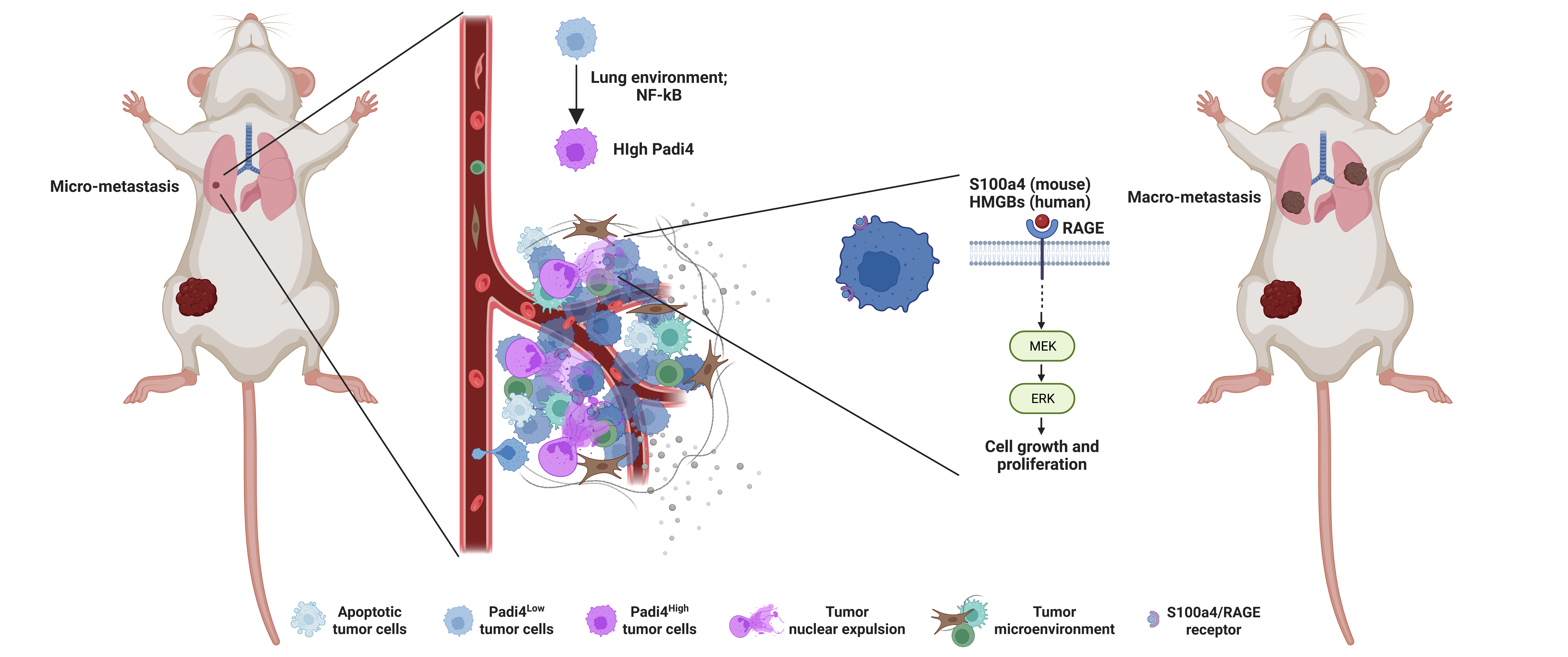 Through the profiling of proteins attached to the chromatin, we discovered an enrichment in RAGE pathway proteins, such as S100a4 in mouse NEPs and HMGB proteins in human NEPs respectively. we were able to demonstrate that the production of NEPs by dying cells facilitates proliferation of nearby tumor cells via activation of the RAGE pathway. These observations were reinforced by a wealth of investigations utilizing a mouse model of lung metastasis, where we observed that interrupting apoptosis, nuclear expulsion, and the RAGE pathway impeded metastatic outgrowth.
