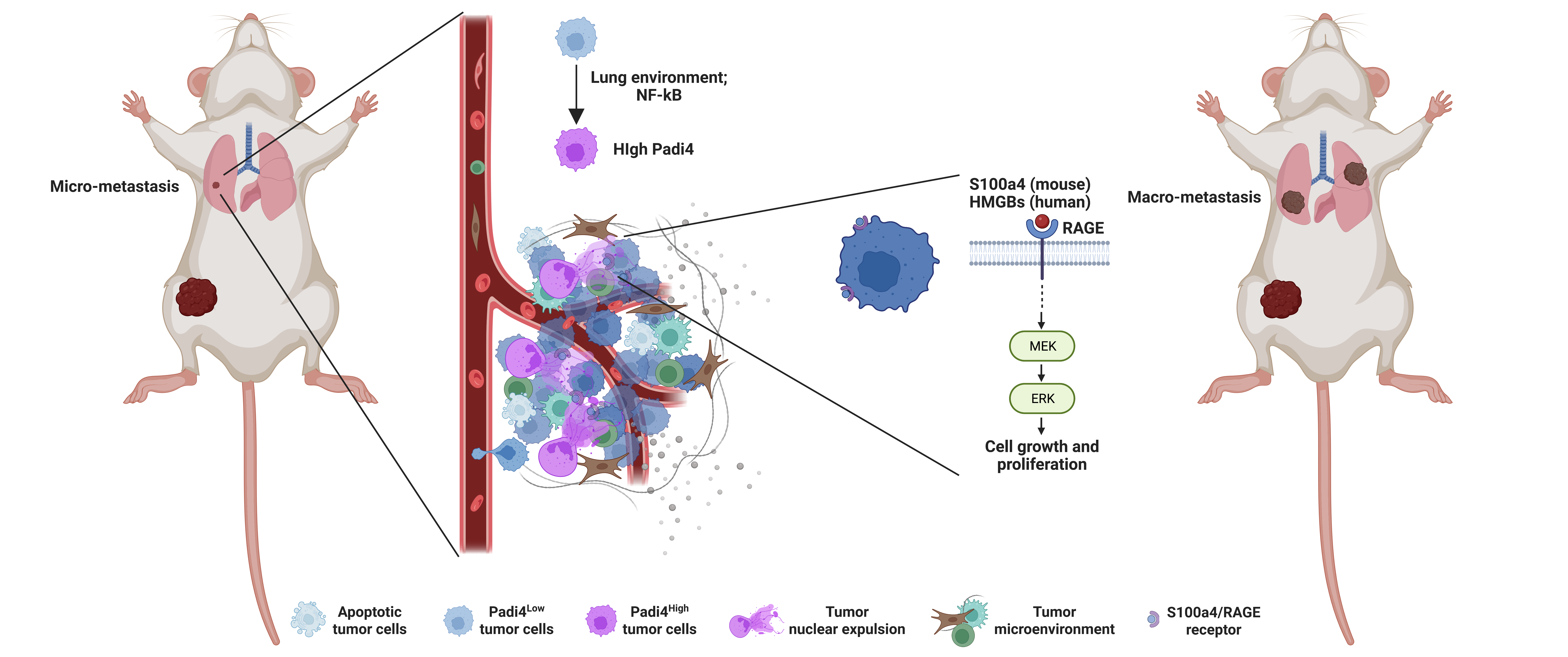 In this study, we report that tumor cells exhibit an altered apoptotic program characterized by nuclear expulsion and citrullinated chromatin which enhances metastatic outgrowth in the lungs in a Padi4-dependent manner. Through single cell tracking, we uncovered that the occurrence of a calcium spike during apoptosis serves as a trigger for the activation of Padi4. This activation subsequently results in the swift de-condensation of chromatin, with a driving force to explode the nucleus and generation of nuclear expulsion products (NEPs).