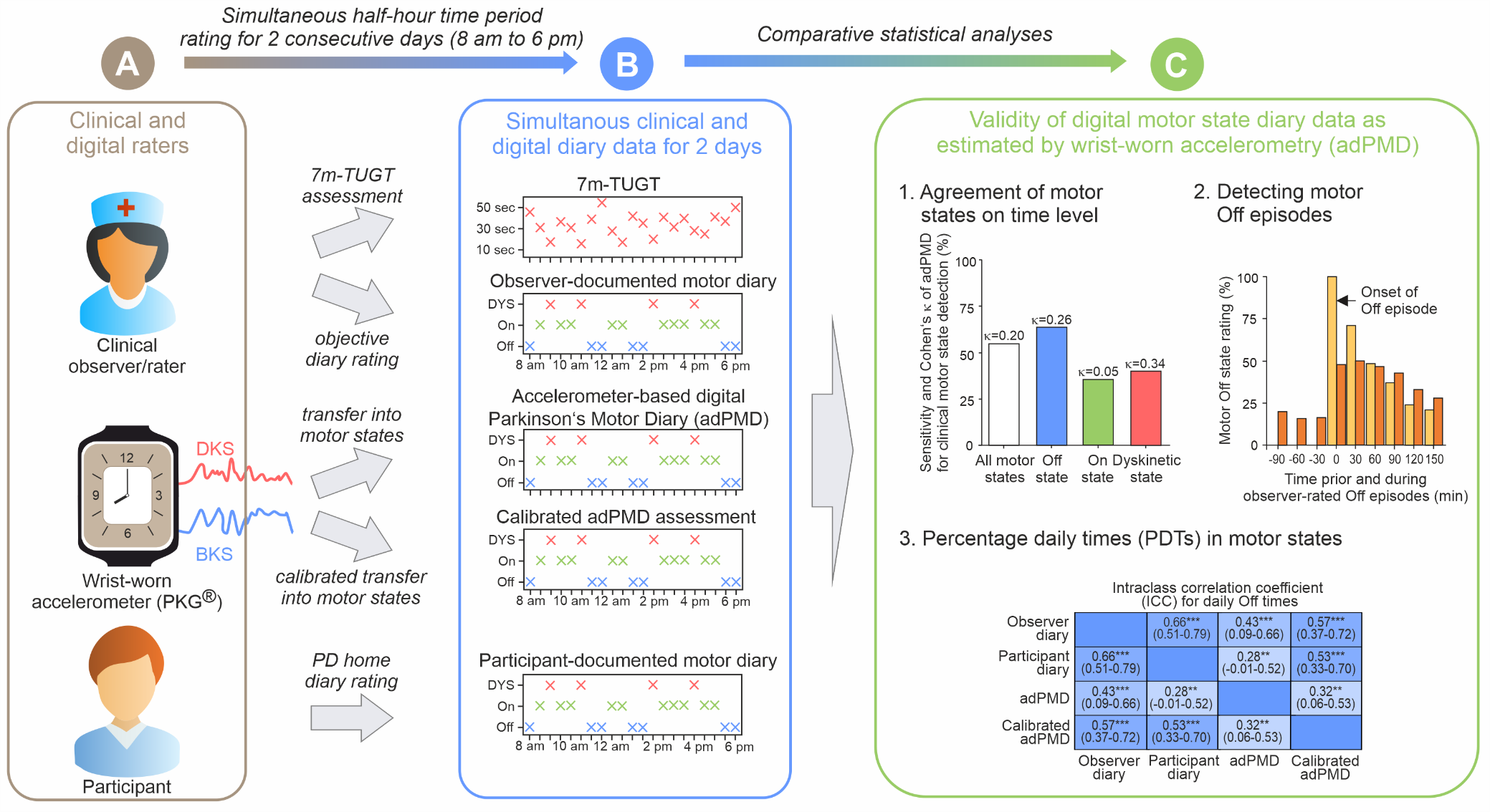 Our primary goal was to determine whether a wearable accelerometer-based digital Parkinson's Motor Diary (adPMD) using the Parkinson's Kinetigraph (PKG®) could accurately capture the clinical motor state when compared to simultaneous half-hourly clinical examinations by experienced raters, utilizing the PD home diary as a reference. The PD home diary entries from day 0 were used for adPMD calibration. On days 1 and 2, patients were additionally observed by an experienced PD rater in half-hour intervals, independently rating the patients’ motor states as Off, On, or dyskinetic. A subcohort performed the 7-meter Timed-Up-and-Go test (7m-TUGT).
