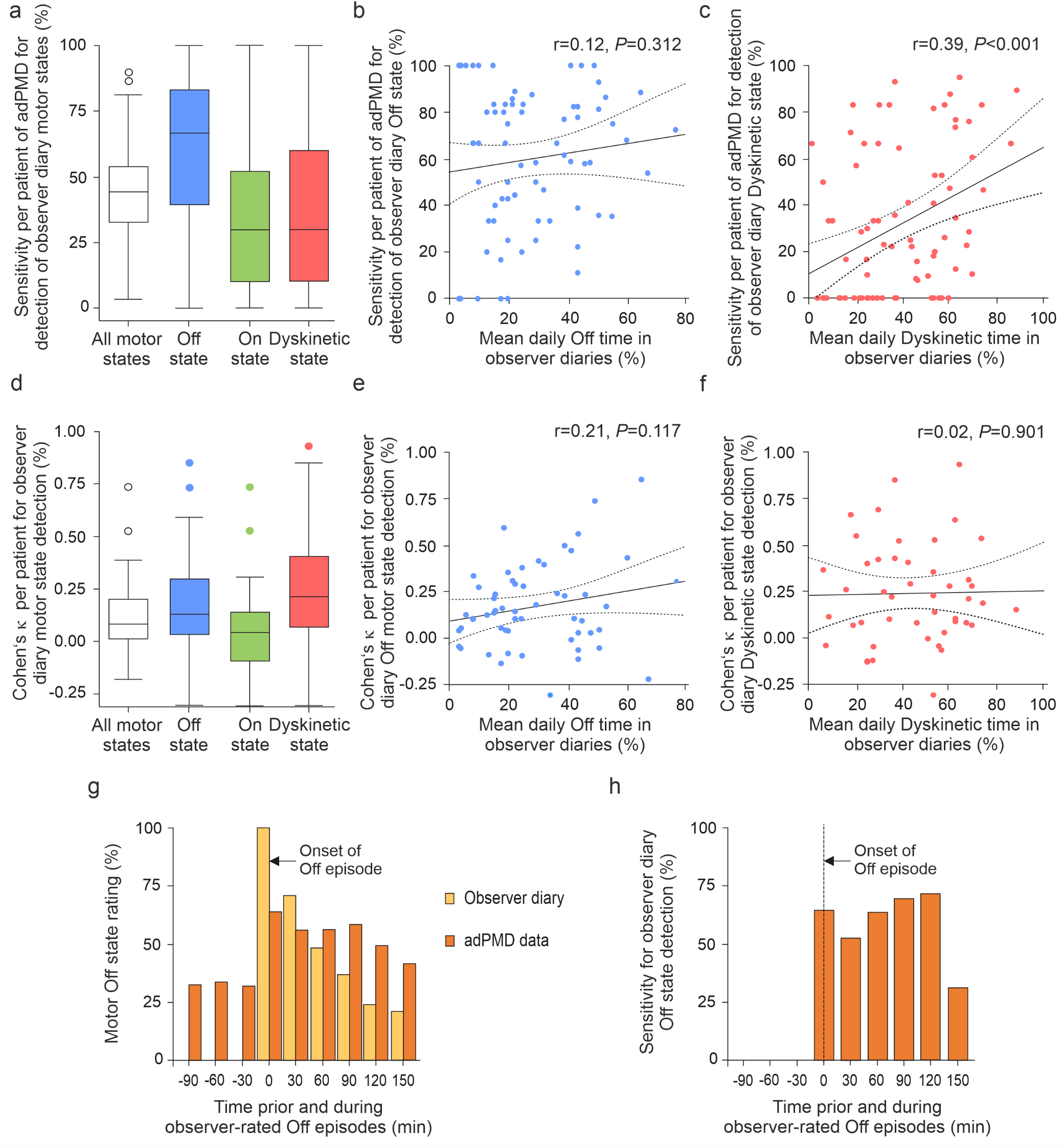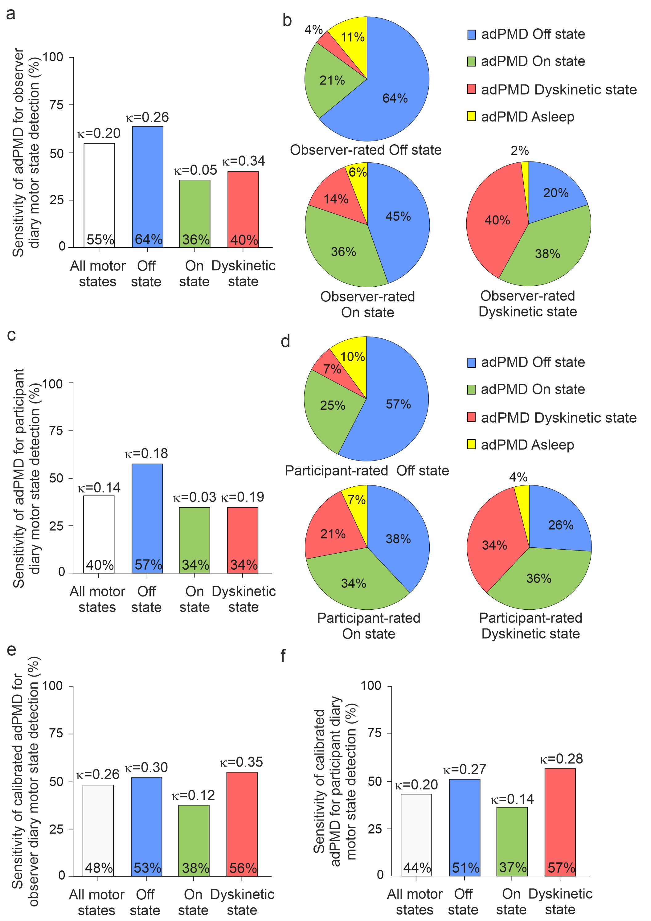 Furthermore, when comparing adPMD data to the patients’ PD home diary entries (Fig. 2c), adPMD accurately recognized 40% of all motor states. Specifically, it correctly identified 57% of patient-rated Off states, 34% of On states, and 34% of dyskinetic states.