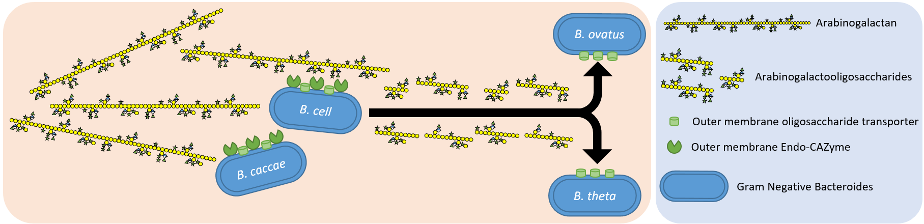 Initial bioinformatic and transcriptomic data revealed two substantial polysaccharide utilization loci directed against AG (Figure 1) which are present in the genome of Bacteroides thetaiotaomicron (B. theta), a Gram-negative species found in the human gut microbiota. However, despite possessing every activity required for utilization of AG, B. theta is unable to utilize the polysaccharide without initial degradation with an endo-arabinogalactanase. Present in the large AG-PUL was an arabinogalactanase which could fulfill the surface oligosaccharide generating role however, it was found in the periplasm. In the degradation of AG by Bacteroides location is everything. It is not enough to produce every enzyme required for glycan utilization, they need to encounter the target polysaccharide in the correct order and in the correct location. This demonstrates the challenge of Gram-negative bacterial nutrient utilization and the requirement of partial deconstruction of the polysaccharide for transport to occur. What modifications must the substrate undergo to allow uptake? In this case the target polysaccharide must be hydrolyzed into oligosaccharides, which creates a new problem. How do you stop oligosaccharide loss at the cell surface? Is it even possible or worth doing so in the complex and competitive environment of the human gut? Bacteroides caccae and Bacteroides cellulosilyticus (B. cell) were found to possess surface endo-activity allowing both of these species to produce oligosaccharides from AG at the cell surface. Of all Bacteroides tested in our study just these two species could utilize undigested AG polysaccharide. Rather than utilizing all AG oligosaccharides produced at the cell surface these species both release oligosaccharides which are capable of supporting AG oligosaccharide species, like B. theta and Bacteroides ovatus. We showed these species do not just produce oligosaccharide for themselves, they also support other Bacteroides species. This is potentially a co-evolved relationship due the relative prevalence of oligosaccharide utilizing Bacteroides, with a few keystone species providing the oligosaccharide required for growth (Figure 2). Interestingly, when performing cross-feeding assays we found preferences showed by the recipients used in the assay. B. ovatus showed preference for oligosaccharides produced by B. caccae whereas B. theta preferred oligosaccharide produced by B. cell. Together, this suggests specific niches within the AG cross-feeding network of Bacteroides species in the gut.
