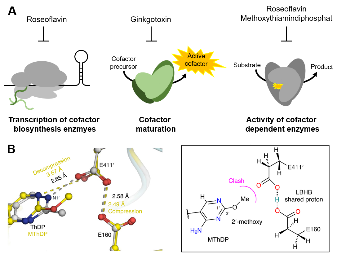 Altogether, the presented data provide a proof-of-principle concept suggesting that antivitamins or derivatives thereof might be exploited to selectively inhibit bacterial cofactor enzymes provided the human orthologs effectively discriminate between vitamin and antivitamin as shown for thiamine enzymes constituting cofactor (vitamin) enzymes as druggable targets with promising potential as antibiotics.