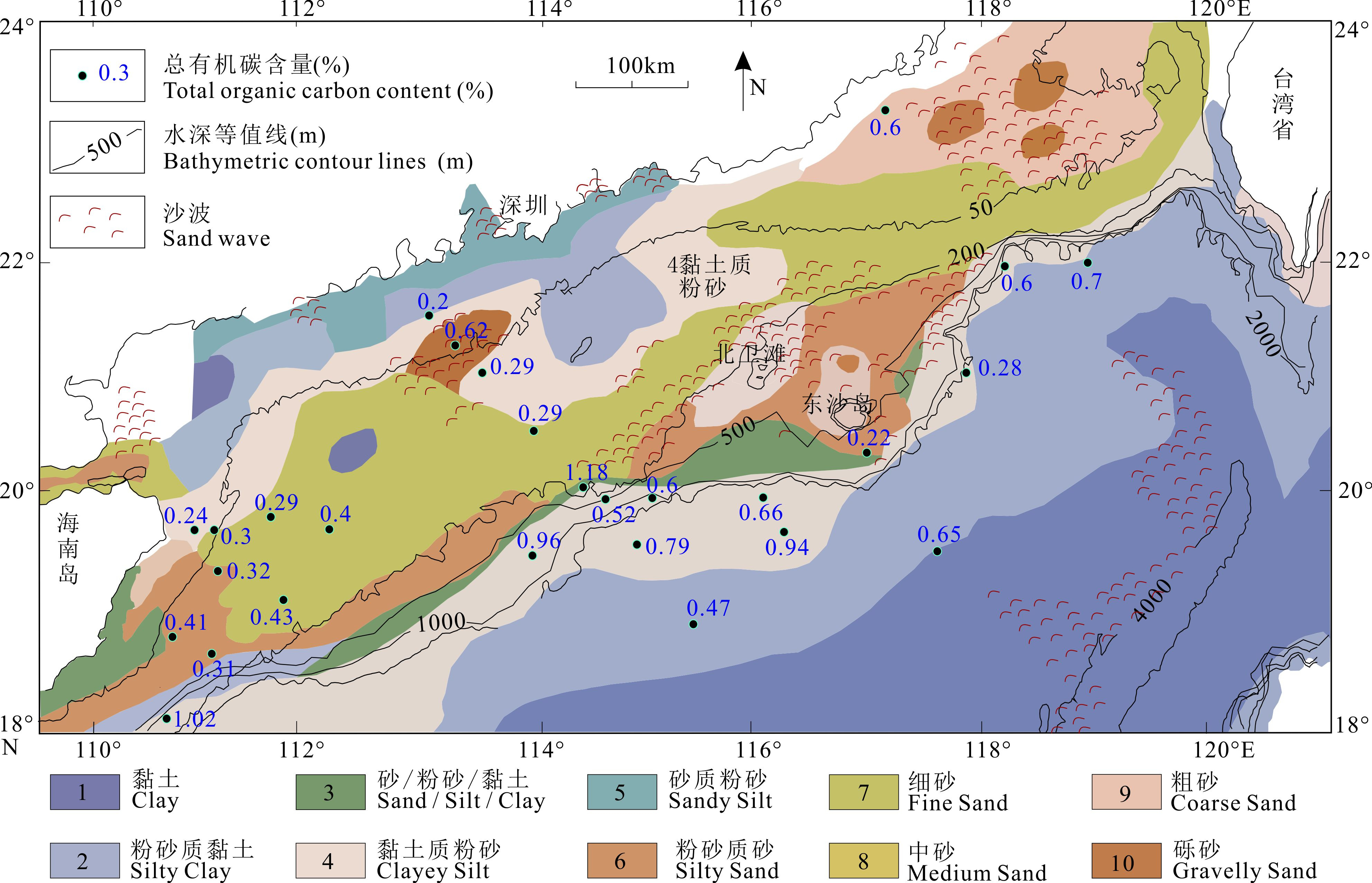 Figure 6: Distribution Map of Surface Sediment Types and TOC Content in the Northern South China Sea, with Low TOC Content and Predominantly Fine Silt.