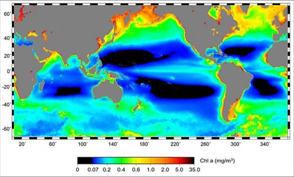 Figure 8: Global Ocean Productivity (Chlorophyll Concentration). Highest Productivity under Cold High-Latitude Climate Conditions