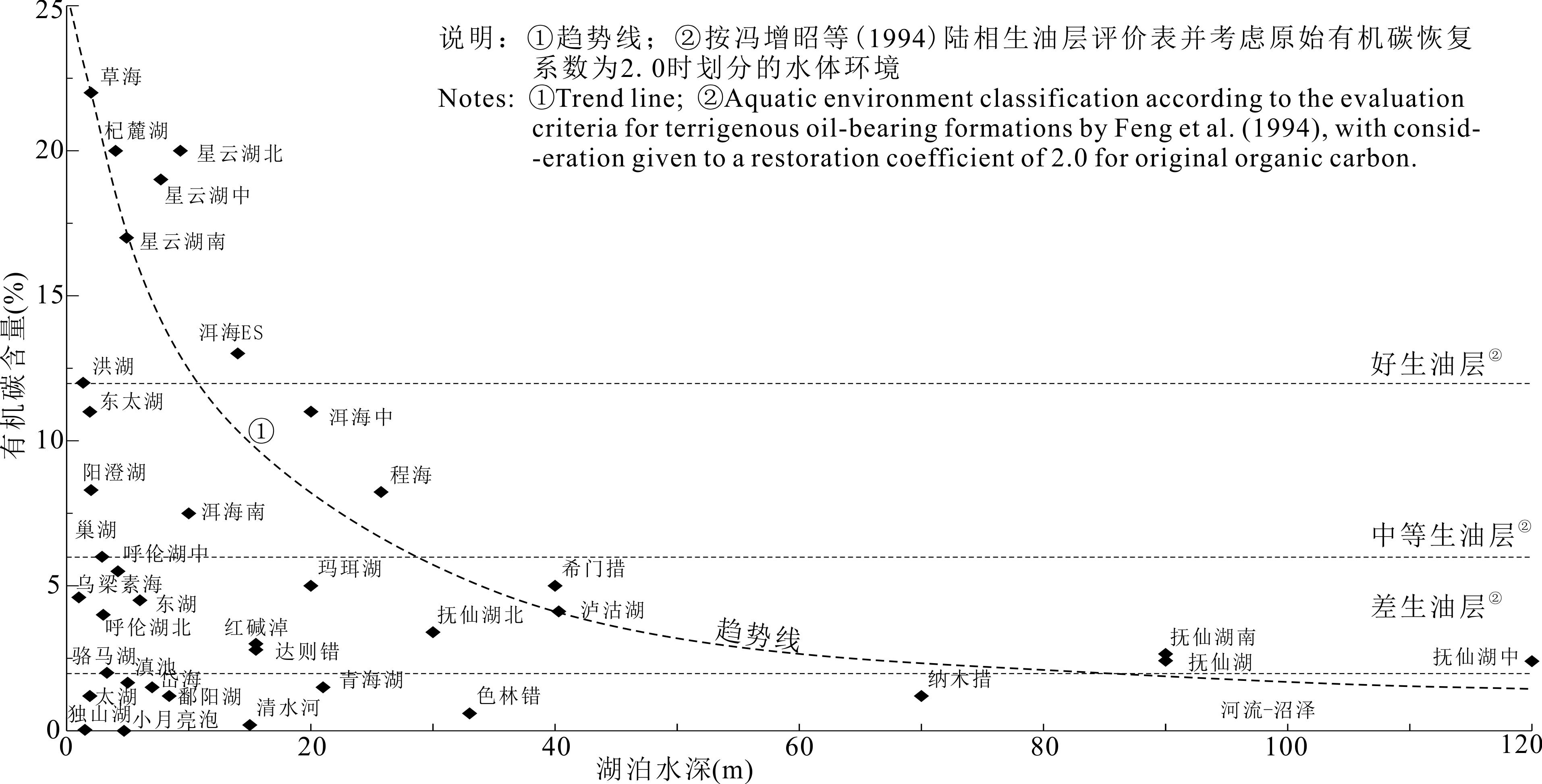 Shallower waters are more conducive to organic matter enrichment and carbon sequestration. The carbon sequestration capacity of water bodies is inversely related to their area and depth (Figure 10). Only well-confined water bodies constitute low-energy environments.