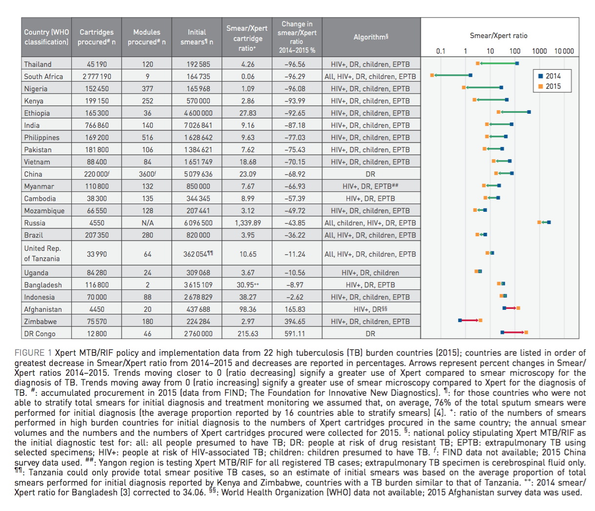 It has been 7 years since the WHO endorsed Xpert MTB/RIF (Xpert) as a diagnostic test for tuberculosis (TB). It is faster and more accurate than smear microscopy and can detect resistance to rifampicin. Yet, smear microscopy is still used as the main diagnostic test, despite the clear advantages of using Xpert. The good news is that progress is being made towards the implementation of Xpert. Our recent study published in the European Respiratory Journal surveyed members from National TB Programmes (NTPs) and affiliated organizations in 22 high TB burden countries (HBCs) on Xpert implementation. We found that overall, these 22 HBCs had increased their implementation of Xpert in the public sector from 2014-2015. A smear/Xpert ratio was used to represent market penetration of Xpert in the public sector in each country. From 2015 to 2016, the median smear/Xpert ratio decreased from 33 to 9, 82% of countries expanded their algorithms to include more WHO-recommended groups, and 9% of countries further decentralized Xpert placement in healthcare systems compared with 2014 (Figure 1).