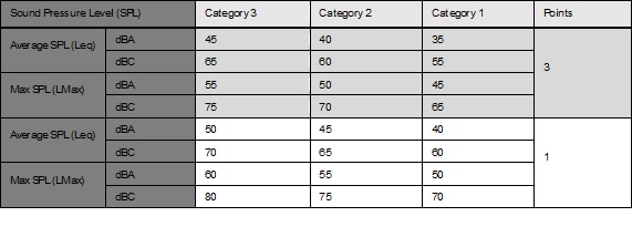 The WELL Building Standard v2 Sound Concept S02 specifies a permissible differential between average sound pressure levels (SPL) (Leq) and maximum SPL (LMax) for A-weighted (dBA) v. C-weighted (dBC) (Table) equal to 20 dB, for each of the following dwelling uses: Category 1 -areas for conferencing, learning or speaking; Category 2 -enclosed areas for concentration; Category 3 -open areas for concentration, spaces with PA systems, and areas for dining. For each metric, background noise levels are measured over a short duration for both A- and C-weightings. To earn optimization points on the WELL project scorecard, the average and maximum sound pressure levels may not exceed the thresholds listed (Table):