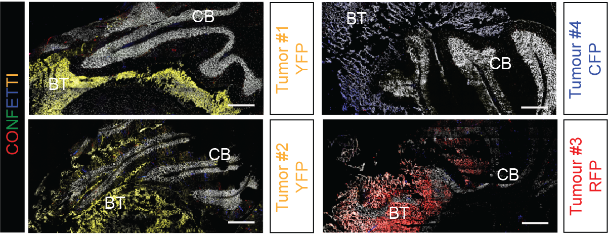 Figure 2. Examples of tumors from the GMYC model crossed with the Confetti fate-tracing system. Monochromia indicates that tumors are a monoclonal cell population and arose from a dominant clone.
