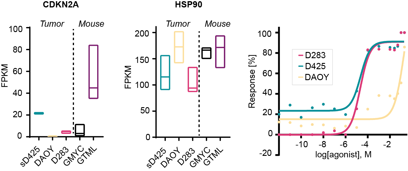 HSP90 activation is known to influence and facilitate DNMT1-driven methylation and was found to be enriched in our MYC-driven model compared to the MYCN-driven model. HSP90 inhibition, through the use of the HSP90 inhibitor, Onalespib, targeted aggressive MYC-driven tumors, but not MYCN-driven tumors, in an ARF-dependent manner. In vitro HSP90 inhibition elicited an ARF-restorative response with subsequent tumor cell death in GMYC cells. Similar results were seen in vivo when tumor-bearing mice were treated with Onalespib – survival time was significantly extended when the treatment was given as a monotherapy, even more so than irradiation treatment. Onalespib therapy failed in tumors where ARF had been knocked out, suggesting a link between HSP90 and ARF, where successful HSP90 inhibitory treatment in brain cancer cells requires presence of functional ARF. These treatment outcomes were mirrored in patient cell lines, supporting the hypothesis that minor expression of CDKN2A, along with MYC-expression, is a requirement for a more sensitive response to HSP90 inhibition, at least when compared to MYCN-driven tumors.