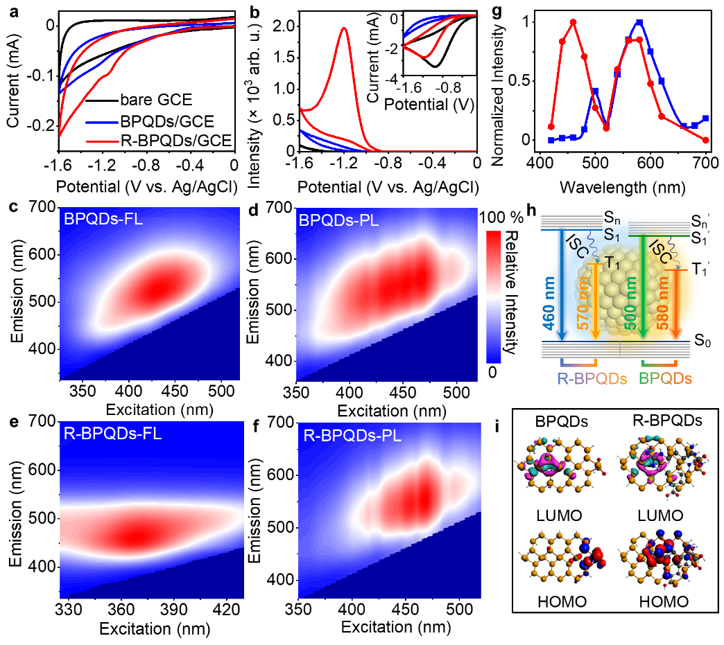 Electrochemiluminescence (ECL) is a light-emitting process, in which the excited state species (R*) are generated via exergonic electron transfer and exchange between the electrogenerated intermediates, following the radiative transitions to the ground state (S0). Generally, the produced R* can be either the lowest excited singlet state (S1) species (1R*) or the triplet state (T1) species (3R*). In this work, Ju’s group found a dual excited states-mediated ECL mechanism with the transitions from both S1 and T1 by using black phosphorus quantum dots (BPQDs) as a nanoemitter, and proposed a strategy to modulate the excited states via arginine (Arg or R) modification of BPQDs (R-BPQDs) to enhance the ECL efficiency.