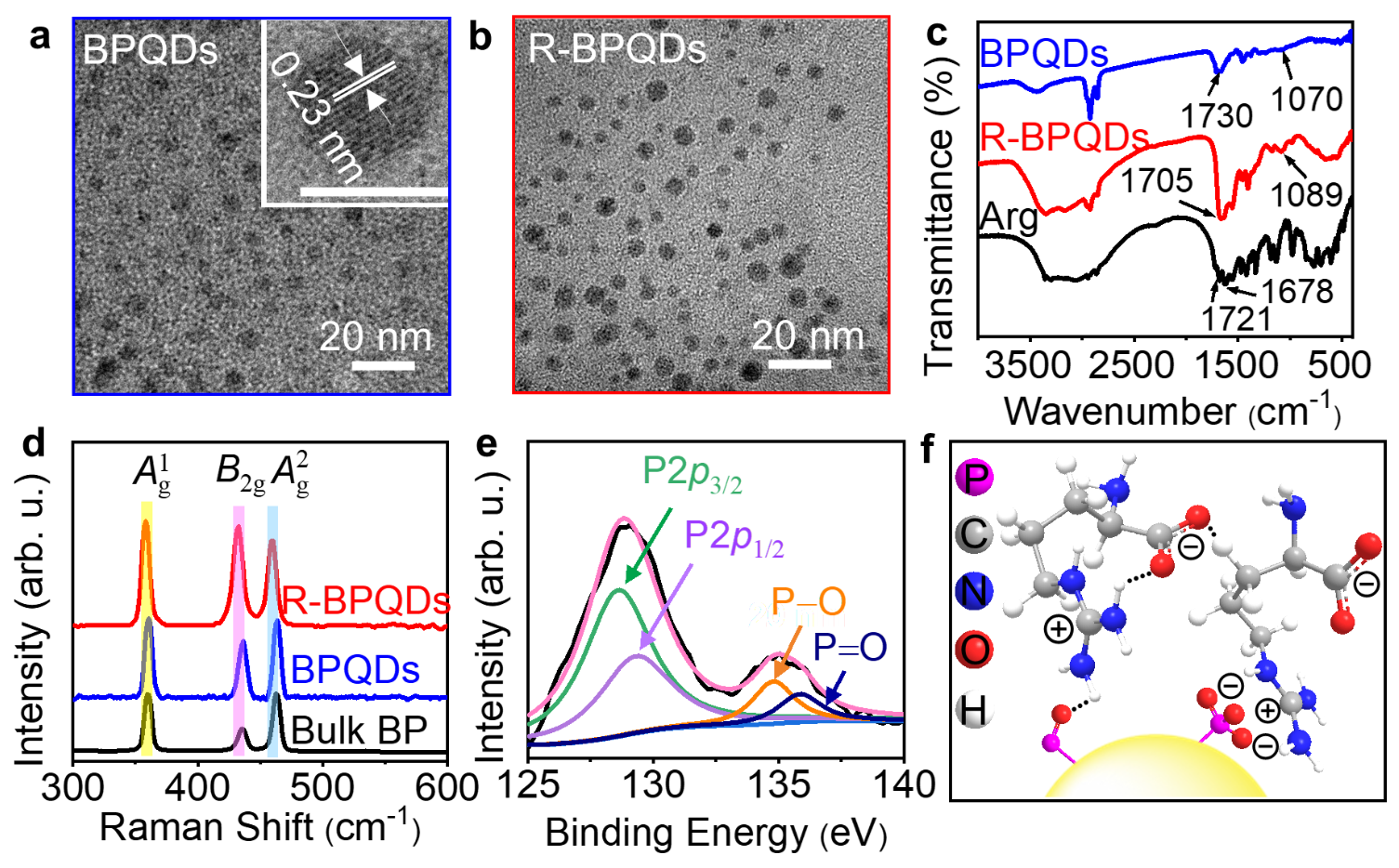 The BPQDs can be conveniently modified with Arg via both the electrostatic interaction of the surface defects with delocalized positive charge of guanidine group and the hydrogen bond interaction between the electron-withdrawing guanidine group and PxOy moiety. The presence of Arg on BPQDs passivates the oxidation defects of BPQDs and increases the negative surface charge due to the exposure of carboxyl group with a pKa value of 2.17, and thus endows BPQDs with better stability, solubility and modifiability for extending the bioanalysis application, which were demonstrated by the Raman spectra, X-ray photoelectron spectroscopic spectra and the Fourier transform infrared spectra (Fig. 1).
