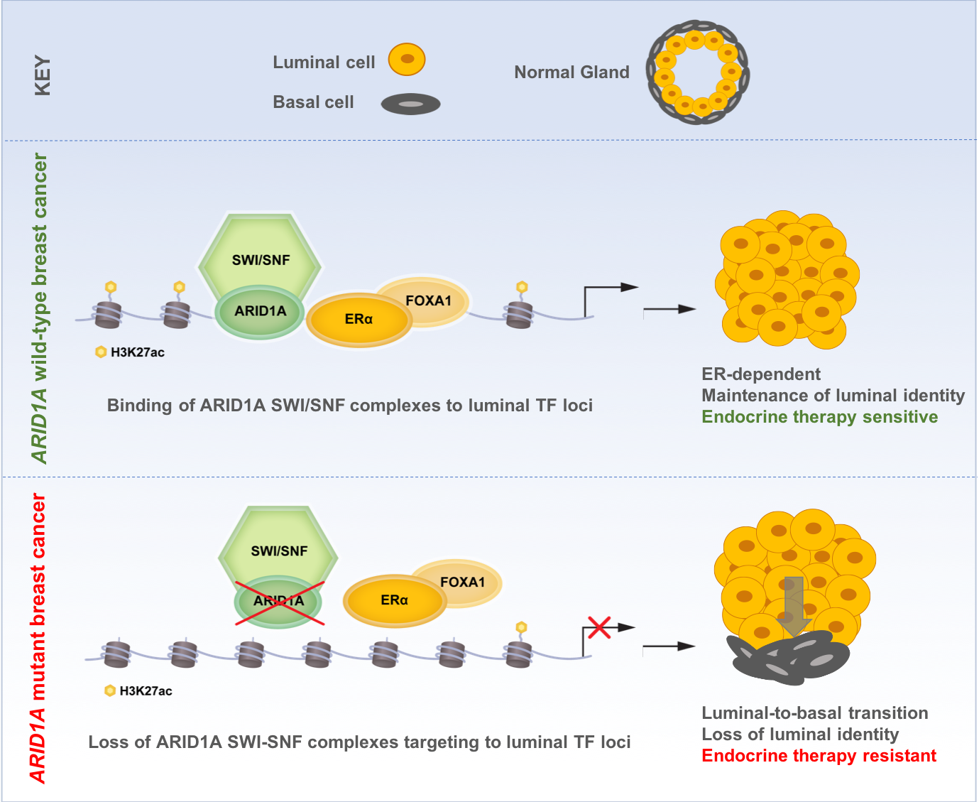 We first confirmed that ARID1A loss mediates fulvestrant resistance using multiple models of ER+ breast cancer including patients tumors harboring ARID1A alterations. We utilized our distinct expertise in computational analyses and epigenetic regulation in breast cancer to generate, analyze, and integrate genome-wide chromatin accessibility, transcriptomic, and chromatin binding assays to examine the global epigenetic consequences of ARID1A loss. We also reached out to a collaborator at Dana-Farber who provided expert advice and performed SWI/SNF chromatin binding assays. These analyses showed that ARID1A loss led to reprograming of the chromatin landscape of breast cancer to regulate the accessibility at luminal lineage determining transcription factors target sites including ER, FOXA1 and GATA3. Interestingly, when we looked at the transcriptomic profile in cell lines and patient tumors with ARID1A loss of function, we found that the signatures looked more like that of basal rather than luminal tumors. Loss of ARID1A-dependent SWI/SNF complex targeting to genomic sites of ER-FOXA1-GATA3 enabled an increased cellular plasticity of luminal cells upon ARID1A inactivation. Thus, ARID1A emerged as a key luminal-lineage regulator whose loss of expression alters luminal differentiation properties and lineage fidelity, leading to loss of dependency on ER and target independence (Figure 1).