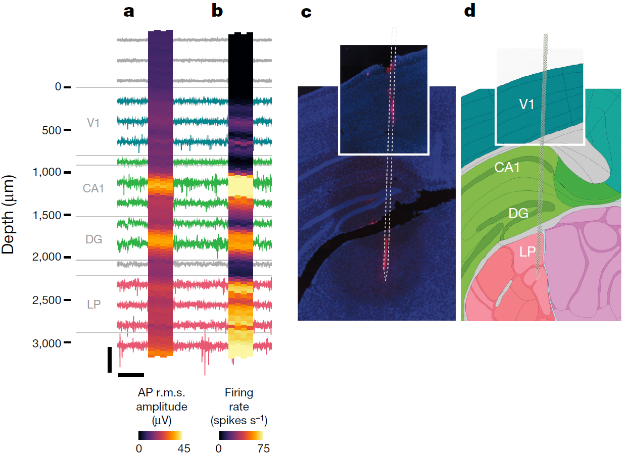 Figure 1: Recording from large neuronal populations with a single probe in an awake head-fixed mouse. Signals were acquired from a Neuropixels probe inserted through primary visual cortex (V1), CA1 and dentate gyrus (DG) regions of the hippocampus, and the lateral posterior (LP) nucleus of the thalamus. Approximate structure boundaries are shown in grey next to the probe depth scale. For the heat maps, each square represents a single site. a, root-mean squared (r.m.s.) amplitude of the action potential (AP) band signal for 1-s intervals, averaged over 10 intervals. b, Firing rate measured from AP band crossings of a − 50 μ V threshold, in a 10-s interval. c, Histological reconstruction of the probe track with 4′ ,6-diamidino-2-phenylindole (DAPI; blue) and DiI (red) staining. d, Corresponding images 81 and 82 from the Allen Mouse Brain Atlas. Image and caption adapted from Jun G.G. et al., Nature, (2017).