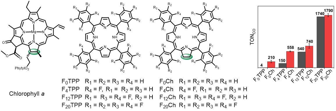 To understand the very different activity between TPP, Ch, and their fluorinated forms, we have performed detailed mechanistic studies to reveal key intermediates and their interconversion during red-light-driven CO2 reduction. For more details on the results, please read our paper: doi.org/10.1038/s41467-024-50084-8