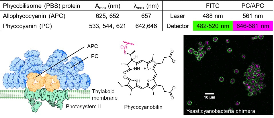 Figure 2: The thylakoid membrane of Syn7942 contains light-harvesting antenna proteins which form the phycobilisome (PBS) complex. These proteins are decorated with chromophores such as phycocyanobilin, permitting easy detection of cyanobacteria by fluorescence microscopy.