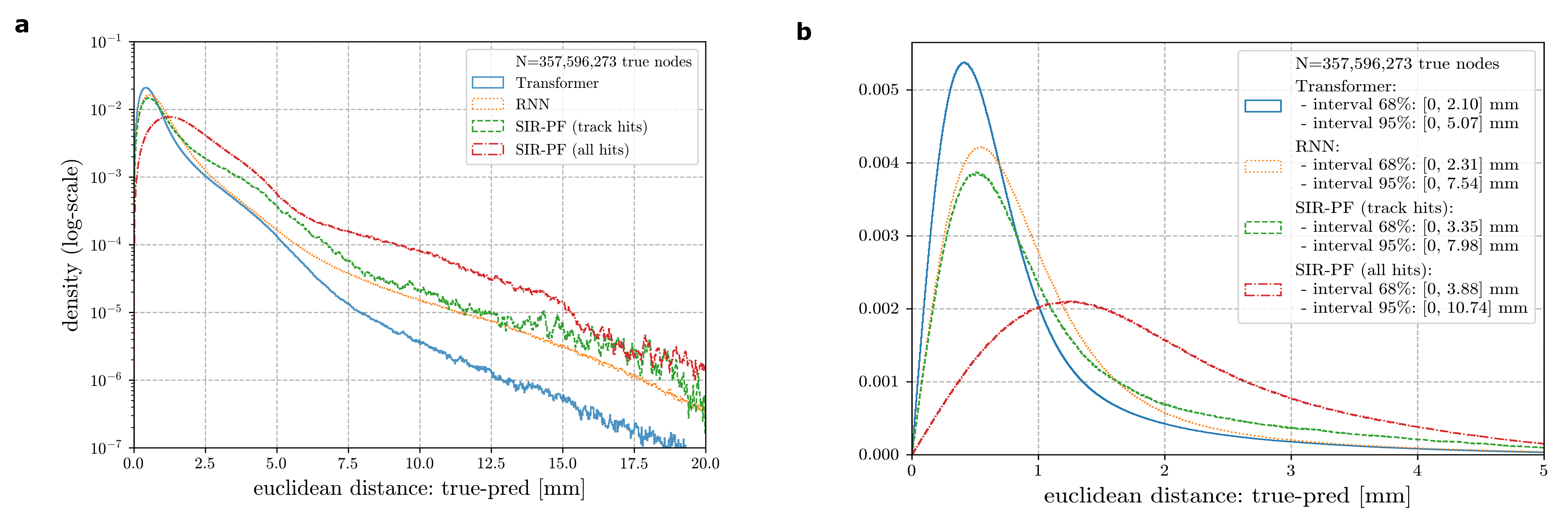 While deep learning has been explored as an alternative to Bayesian filtering in various applications, its application in particle tracking has been limited to connecting detected hits to form particles rather than fitting the detected hits to approximate the actual particle trajectory. The article proposes using recurrent neural networks (RNNs) and Transformers, borrowed from natural language processing, for fitting particle trajectories. These neural networks, resembling Bayesian filters with hyper-informative priors, have the potential to improve the accuracy and resolution of particle trajectory reconstruction significantly. Figure 1 compares the performance of the three methods, indicating that the Transformer and the RNN outperform standard techniques.