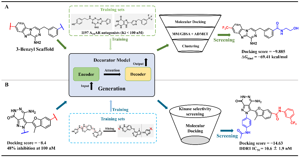 These generative models not only demonstrate significant technical innovation but also exhibit great value in practical applications, especially at the local and global levels of molecular optimization. For example, DeepFrag leverages protein-molecule interaction data to accelerate the development of anti-SARS-CoV-2 lead compounds (Figure 3A) and the optimization of Topo IIα inhibitors for enhanced anticancer potency (Figure 3B). Similarly, Scaffold Decorator integrates bioactivity data with various derivatization strategies to facilitate the discovery of highly selective adenosine A2B receptor antagonists (Figure 4A) and novel DDR1 inhibitors (Figure 4B).