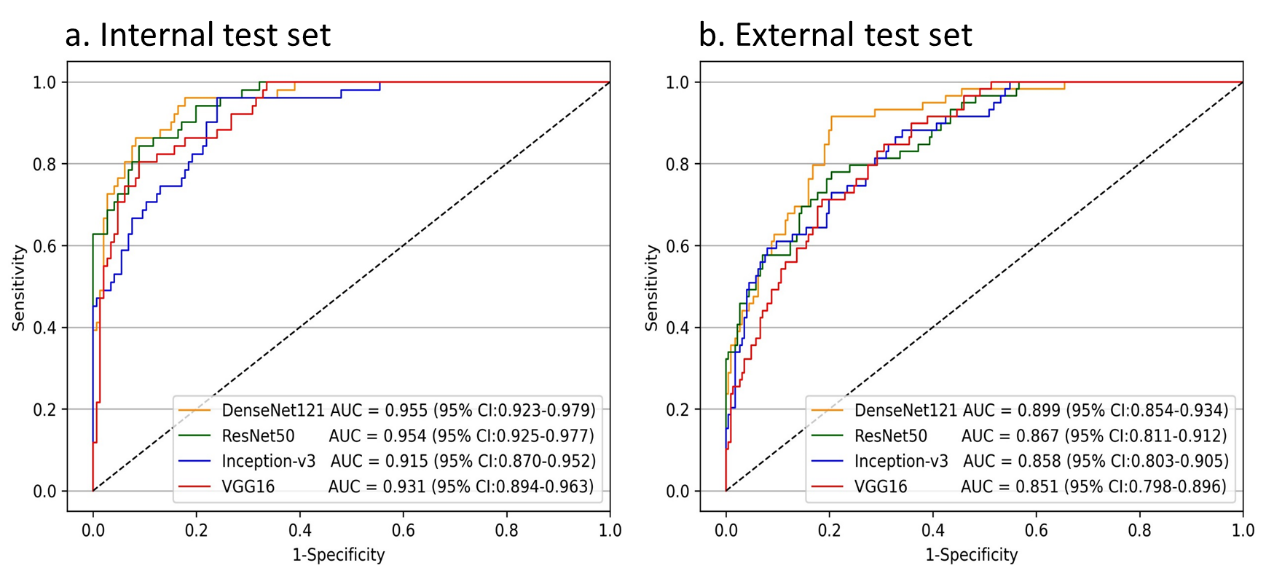 The findings shown in Figure 3 demonstrated that deep learning classification algorithms performed well in discerning malignant eyelid tumors and the algorithm DenseNet121 had better performance than the other three algorithms. The generalizability of our system was confirmed on the basis of its good performance (AUC 0.899, sensitivity 91.5%, specificity 79.2%) in the external test set, of which images were collected from two other hospitals. When compared to the ophthalmologists of different levels, the system’s sensitivity was higher than that of the junior and senior ophthalmologists and comparable to that of the expert, while the system’s specificity is lower than that of the expert.