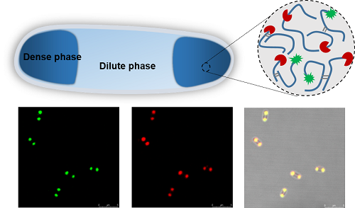 Our lab has long been focusing on the design and biosynthesis of protein polymers and biomaterials1, and my first project was actually the production of recombinant spider silk proteins in the bacterial cell factory Escherichia coli, following the endeavors of my advisors and lab seniors2,3. At first, I came up with an idea to label the spider silk protein with a green fluorescent protein, aiming to “see” the silk production levels in the bacterial cells by measuring fluorescence. Unfortunately, this did not always work reliably. The lucky thing was that my supervisor advised me to investigate the intracellular distribution of the spider silk proteins via fluorescence microscopy. Interestingly, the recombinant spider silk proteins spatially localized near the pole regions of E. coli cells (see Figure 1 below), which shocked me, simply because the silk proteins were expressed in a soluble form instead of insoluble inclusion bodies that are commonly seen in prokaryotic expression systems. Then, why and how the silk proteins condense in the living cells? It was later made clear that our spider silk proteins, natively unfolded and disordered with low-complexity sequences, share common features with the eukaryotic LLPS proteins that are naturally involved in membraneless organelle formation. Then we verified that LLPS underlay the formation of silk condensates within E. coli cells, and demonstrated functionalization of the synthetic membraneless compartments with biocatalytic activities4. Furthermore, we found that other disordered structural proteins (e.g. resilin) formed similar compartments inside the E. coli cells, indicating applicability of our compartmentalization strategy with heterologous structural proteins. In addition, the bacterial cell physiology was not substantially altered with the emergence of subcellular liquid condensates, indicating their good potential for biotechnological applications.