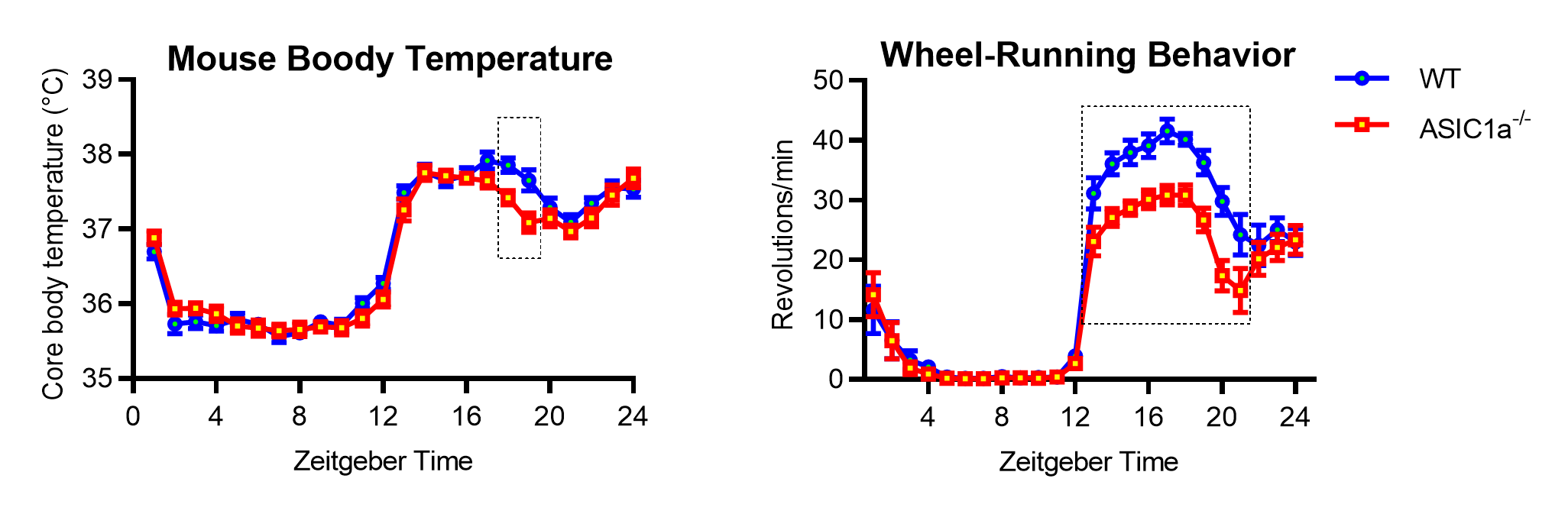 The duration of the daily cycle under constant darkness (the "free-running period") was slightly increased in ASIC1a-/- mice. Interestingly, ASIC1a-/- mice showed lower voluntary activity than WT mice throughout the active period (right panel on graph). The mechanisms underlying the daily rhythm regulation of body temperature and wheel-running behavior differ, with body temperature rhythms being jointly regulated by the signals from the central and the peripheral nervous system, while wheel-running behavior is primarily controlled by the signals from the central nervous system.