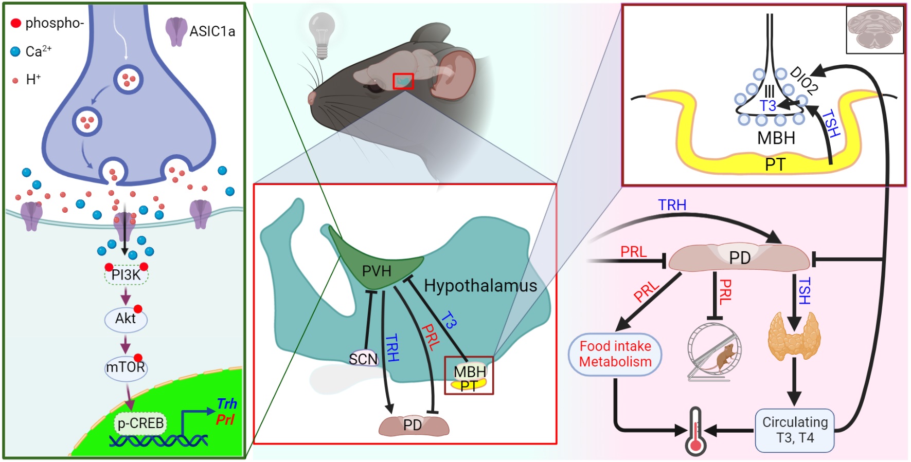 We validated that ASIC1a's daily rhythmic expression regulates the PI3K-Akt-mTOR signaling pathway to modulate the expression of prolactin and thyrotropin-releasing hormone (TRH). Prolactin can influence both body temperature regulation and mouse wheel-running behavior. On the other hand, TRH leads via the hypothalamic-pituitary-thyroid axis to the release of the thyroid hormones T3 and T4, which regulate body temperature and control hypothalamic activity by providing feedback to the central nervous system. We found that thyroid-stimulating hormone mRNA in the pituitary was also differently regulated in ASIC1a-/- mice, consistent with an involvement of ASIC1a in the signaling along the hypothalamic-pituitary-thyroid axis. However, the concentrations of the thyroid hormones T3 and T4 in the serum were not affected by ASIC1a deletion, indicating that despite the changed signaling in the hypothalamus and the pituitary, ASIC1a regulates the body temperature not via the thyroid hormones.