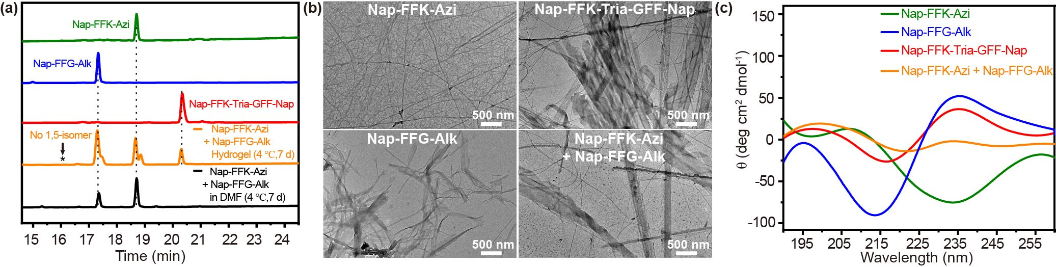 We first synthesized the three compounds Nap-FFK-Azi, Nap-FFG-Alk, and Nap-FFK-Tria-GFF-Nap. Besides from the desired product of Nap-FFK-Tria-GFF-Nap (retention time 20.3 min), the by-product 1,5-isomer of Nap-FFK-Tria-GFF-Nap (retention time 16.1 min) also appeared on the HPLC trace (Fig. 2), suggesting poor regioselectivity of CuAAC.