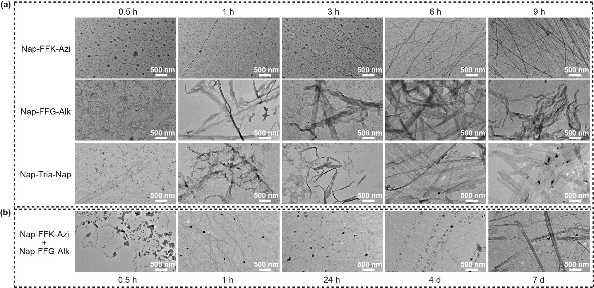 To validate the mechanism of assembly-driven regionally selective azide-alkyne cycloaddition reaction, we used TEM observations to real time monitor the formation of above nanostructures. TEM images in Fig. 4a showed that, at 0.5 h, those raw materials at nanoscale for self-assembling into bigger nanostructures (e.g., nanoparticles for nanofiber formation, nanofibers for nanoribbon formation) started to appear in hydrogels of Nap-FFK-Azi and Nap-FFG-Alk, or solution of Nap-FFK-Tria-GFF-Nap. The final nanostructures (i.e., nanofibers in hydrogel Nap-FFK-Azi, nanoribbons in hydrogel Nap-FFG-Alk and solution Nap-FFK-Tria-GFF-Nap) started to form at 3 h and stabilize at 6 h. In contrast, TEM images of Nap-FFK-Azi + Nap-FFG-Alk hydrogel showed that dense and slim nanofibers (i.e., Nap-FFK-Azi nanofibers) formed at 3 h (Fig. 4b). After that, from 24 h to 4 d, we found that nanoparticles (i.e., generation of the cycloaddition product Nap-FFK-Tria-GFF-Nap) were continuously generated along the nanofibers. Finally, the nanoparticles connected with each other to form helical nanoribbons at day 7. This result also indicates that occurrence of the cycloaddition reaction in Nap-FFK-Azi + Nap-FFG-Alk group improve the stability of the intermediate nanoribbon structure of the two precursor peptides to the final nanoribbons. Above TEM observations directly validate our hypothesis that, along with the self-assembly of nanofiber, Nap-FFK-Azi or Nap-FFG-Alk is drawn near to the nanofiber with space-confined effect, undergoing cycloaddition reaction to yield regionally selective product Nap-FFK-Tria-GFF-Nap.