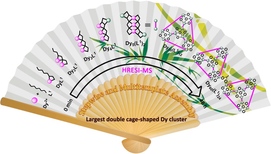 In our latest paper, we synthesized a double-cage dysprosium cluster Dy60 by using a multidentate chelate-coordinated diacylhydrazone ligand under solvothermal conditions. Two Dy30 cages were included in the Dy60 structure, and the above two cages were connected via OAc-. The core of Dy60 was composed of eight triangular Dy3 and twelve fold linear Dy3 units. We further changed the alkali added in the reaction system and successfully obtained a single caged-shaped cluster Dy30, which could be considered an intermediate in Dy60 formation. Time-dependent, high-resolution electrospray ionization mass spectrometry (HRESI-MS) was used to track the formation of double-cage dysprosium cluster Dy60. Seven intermediate fragments were screened and further combined with the changing trend of intermediate fragments in different time periods. The possible self-assembly mechanism was proposed as follows: H6L1→DyL1→Dy2L1→Dy3L1→Dy4L1→Dy5(L1)2→Dy30(L1)12→Dy60(L1)24. We tracked the formation of Dy30, and the six intermediate fragments were screened. We proposed the following possible assembly mechanism: H6L1→DyL1→Dy2L1→Dy3L1→Dy4L1→Dy5(L1)2→Dy30(L1)12. The assembly mechanism of Dy30 further verified the formation of Dy60. To our knowledge, this work is the first to use HRESI-MS for tracking the formation of cage-shaped Ln(III) clusters. This work provided a set of methods to study the formation tracking and assembly mechanism of high-nuclear lanthanide clusters. It also lays the foundation for the further design and manipulation of high-nuclear lanthanide clusters.