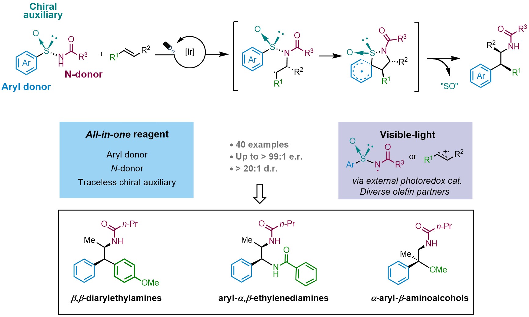 Inspired by these results, our recent work published now in Nature Chemistry (2023, DOI: 10.1038/s41557-023-01414-8) reports a multifunctional all-in-one arylsulfinylamide reagent featuring a traceless chiral auxiliary for the asymmetric intermolecular aminoarylation of alkenes. We hypothesized that the intermolecular addition of the nitrogen atom to a 1,2-disubstituted alkene would lead to the formation of a Csp3–N bond whose absolute configuration would be controlled by the chiral sulfinyl tether. The subsequent radical Truce-Smiles rearrangement of the aryl moiety would then establish the configuration neighboring Csp3–Csp2 center. This methodology provides access to valuable β,β-diarylethylamines, aryl-α,β-ethylenediamines and a-aryl-b-aminoalcohols with excellent levels of both relative and, more importantly, absolute stereocontrol. The sulfinyl group in the reagents is eliminated in situ under mild reaction conditions. Characterization of the reaction mechanism revealed an interesting dichotomy in the initiation of the photoredox catalytic cycle wherein either electron-rich alkenes or the sulfinylamides are preferentially activated by the Ir photocatalyst at the outset of the reaction (Fig. 2).