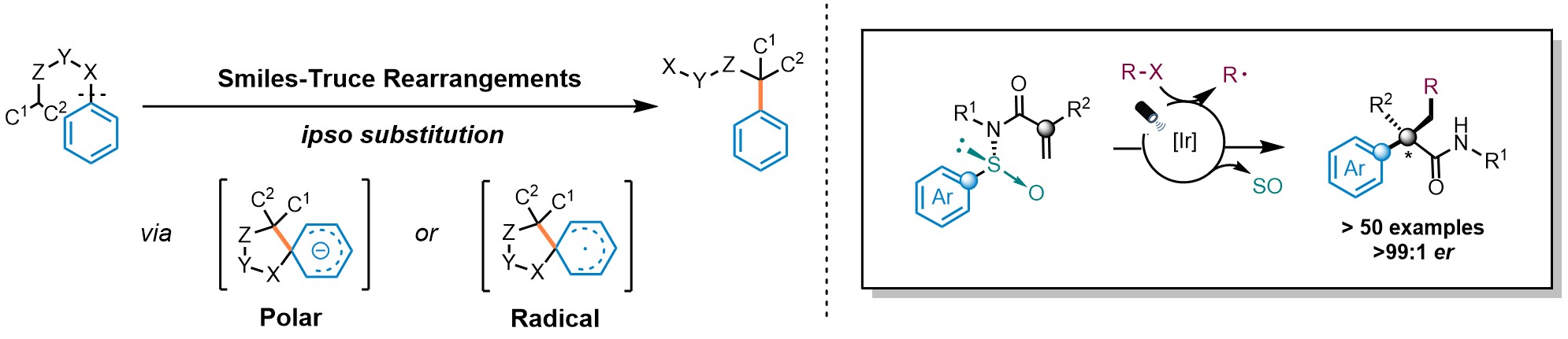 Arylethylamines are key motifs featured in a plethora of biologically active molecules. Despite their relevance, their asymmetric construction still represents a longstanding pursuit within the organic chemistry community. The use of cyclic intermediates to impart stereocontrol is an appealing strategy and thus, rearrangement reactions have emerged as prominent platforms in this context. The Smiles-Truce rearrangement has experienced a renaissance in the past few years. This transformation, orchestrated either via polar or radical mechanisms, involves the cleavage of a Csp2-X bond, followed by the formation of a novel Csp2-C bond at the ipso position via a spirocyclic intermediate (Fig. 1 left). Recently, our group described a radical Smiles-Truce rearrangement featuring N-arylsulfinyl acrylamides (Nat. Chem. 13, 327–334 (2021), Fig. 1 right). The reaction is initiated by the addition of a radical to the double bond and the N-sulfinyl group is responsible to impart absolute stereocontrol during the transposition of the aromatic ring yielding enantioenriched α-all-carbon substituted amides.