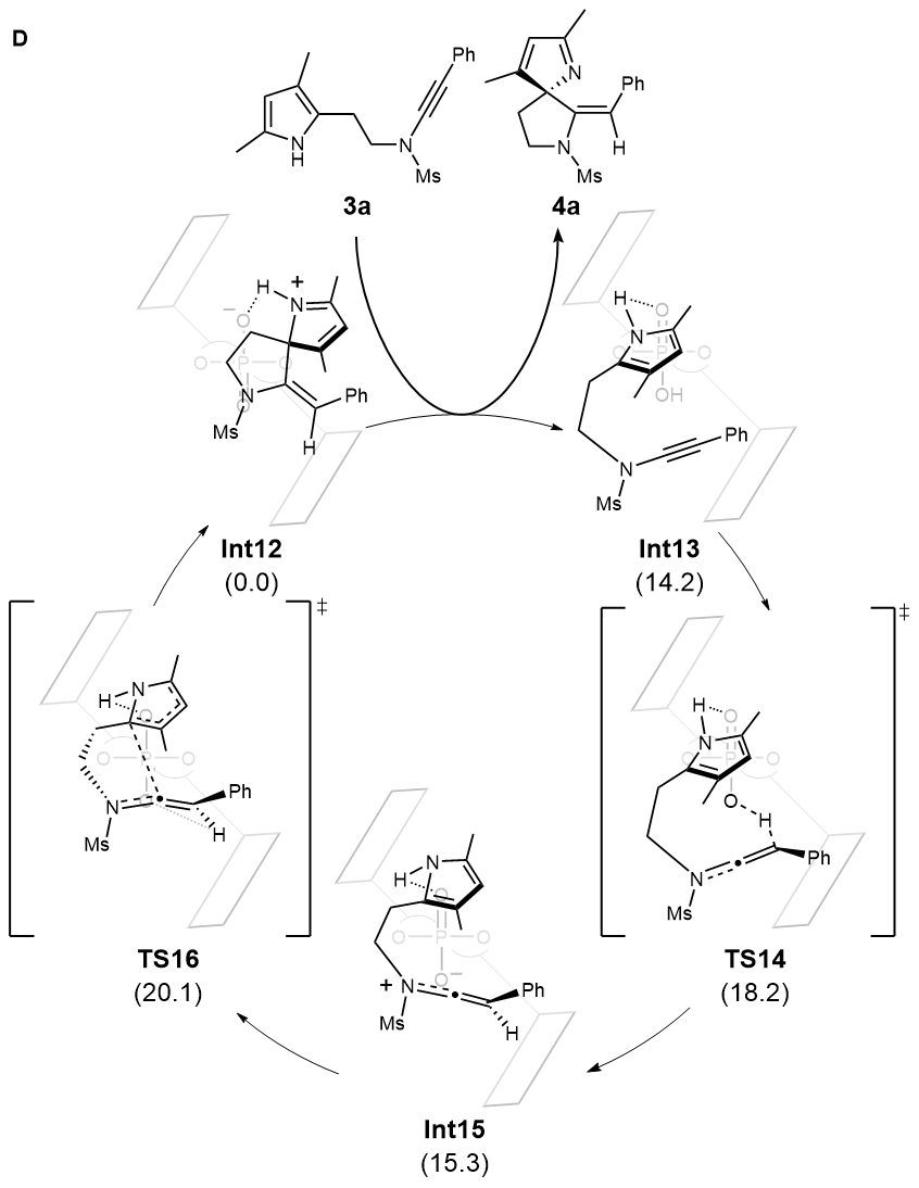 Density functional theory (DFT) calculations based on pyrrole-ynamide substrate were also carried out. The results indicated that a rapid and reversible protonation process of substrate leads to a keteniminium intermediate, attaching to chiral catalyst with both hydrogen bonding and ion pair interactions. The further nucleophilic attack of pyrrole ring with the irreversible formation of C-C bond was identified as the rate- and enantioselectivity-determining step, affording the corresponding product and releasing the catalyst (Fig. D).