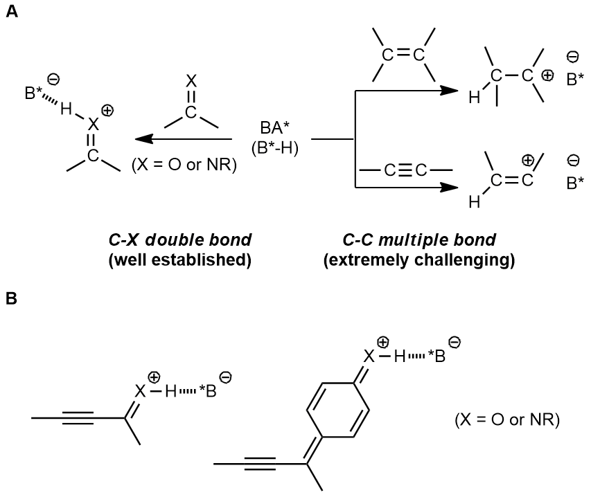 Chiral Brønsted acids have been widely employed in asymmetric synthesis over the past decades, and numerous efficient synthetic methods have been developed based on this approach. However, those transformations were always triggered by the direct activation of carbon-heteroatom double bonds, such as imine and carbonyl compounds. It is explicit that the protonation of imines and carbonyls by chiral Brønsted acid leads to a stable intermediate, hydrogen-bonding with the conjugate base of chiral Brønsted acid. The hydrogen bond is considered as an anchor to generate a rigid structure of the transition state, which is beneficial for stereocontrol. In contrast, protonation of alkenes and alkynes affords a carbocation species, connecting with conjugate base of chiral Brønsted acid through a relatively weak electrostatic interaction, which is unfavorable in controlling the enantioselectivity (Fig. A). Although the direct activation of different kinds of C-C double bonds such as dienes[5], electron-rich alkenes[6] and unbiased olefins[7] through chiral Brønsted acid have been reported in a few examples, the direct activation of alkynes has so far not been invoked. Of note, electron-efficient alkynes could be involved in chiral Brønsted acid catalysis, where chiral Brønsted acid were essentially used to activate the imine and carbonyl moieties (Fig. B) but not carbon–carbon triple bonds.