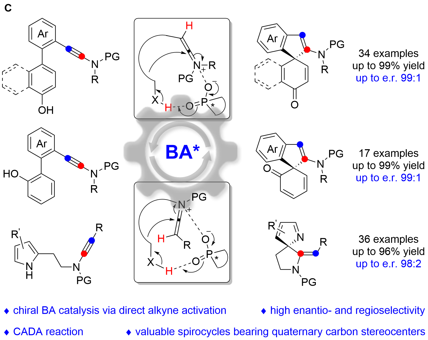 We herein report that chiral Brønsted acid enable the catalytic asymmetric dearomatization (CADA) reactions of naphthol-, phenol- and pyrrole-ynamides by direct activation of ynamides, which represents the first chiral Brønsted acid catalysis via the direct activation of carbon–carbon triple bonds (Fig. C). At the beginning, naphthol-ynamide substrates were designed and employed for the optimization of CADA reaction. Gratifyingly, with the chiral Brønsted acid bearing a skeleton of BINAP, we could realized the practical and atom-economical synthesis of a wide range of valuable spirocyclic enones with a chiral quaternary carbon stereocenter in generally high yields with excellent enantioselectivities (up to 99:1 e.r.). Furthermore, we subsequently synthesized the ortho-substituted phenol-ynamides, which are more challenging to be dearomatized because of the relatively stronger aromaticity of phenols. To our delight, through the extensive optimization, the corresponding spirocyclic products could be obtained with satisfying results (up to 99:1 e.r.) and the seven-membered byproduct led by O-cyclization could be perfectly inhibited. What’s more, the substrate scope could be further extended to pyrrole-ynamides, furnishing valuable chiral spirocyclic 2H-pyrroles in good to excellent yields with high enantioselectivities (up to 98:2 e.r.). Significantly, excellent E/Z ratios (>20:1) were detected in these cases.