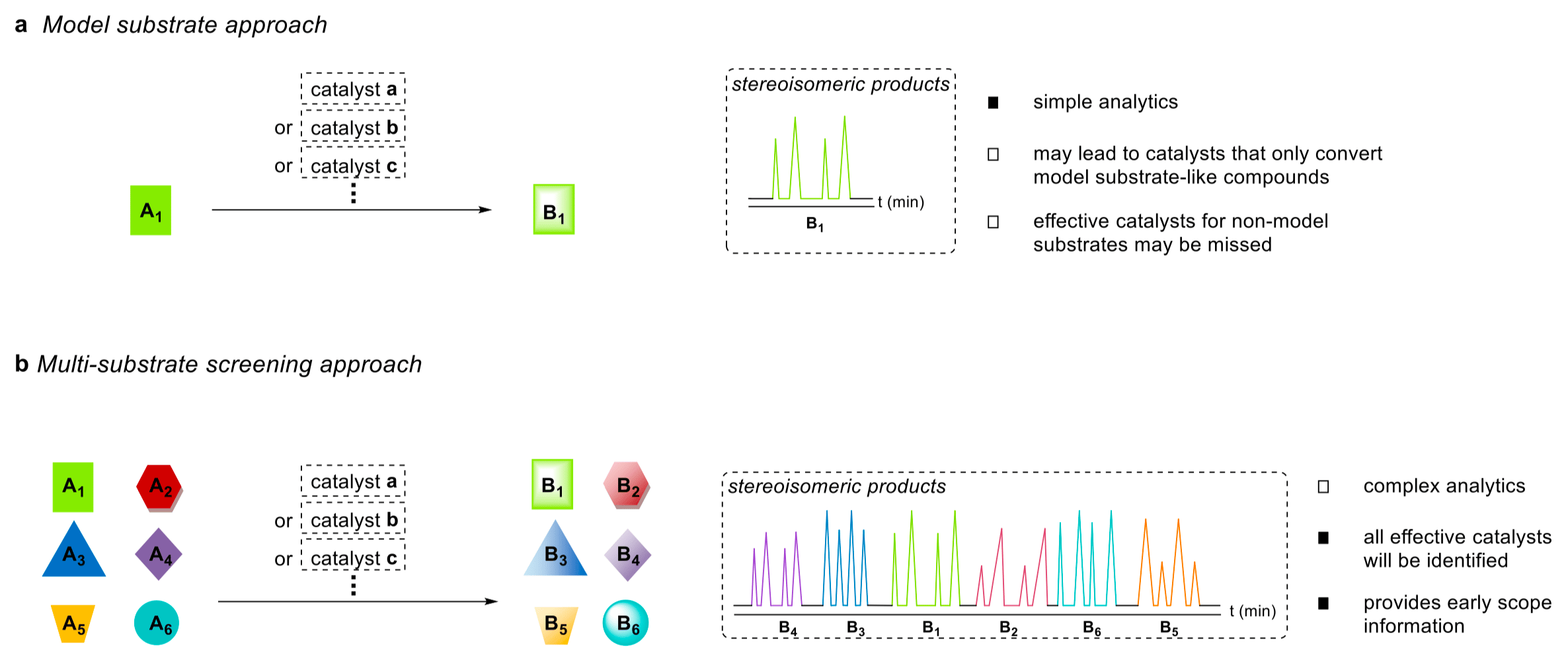 Traditionally, organic chemists on the quest for new asymmetric, catalytic transformations rely on a so-called model substrate approach (a) – a long-standing strategy that led to numerous chemical reactions which have become indispensable to those engaged in synthesis. Unfortunately, scopes are occasionally rather narrow, i.e. only compounds resembling the model substrate may be transformed, which poses a severe constraint on the aforementioned strategy. In light of the shortcomings of this classical approach, Kagan et al. introduced the concept of one-pot, multi-substrate screening in 1998. [1] This contrasting strategy features the simultaneous exposure of a set of structurally distinct substrates to a catalyst in a single reaction vessel (b).