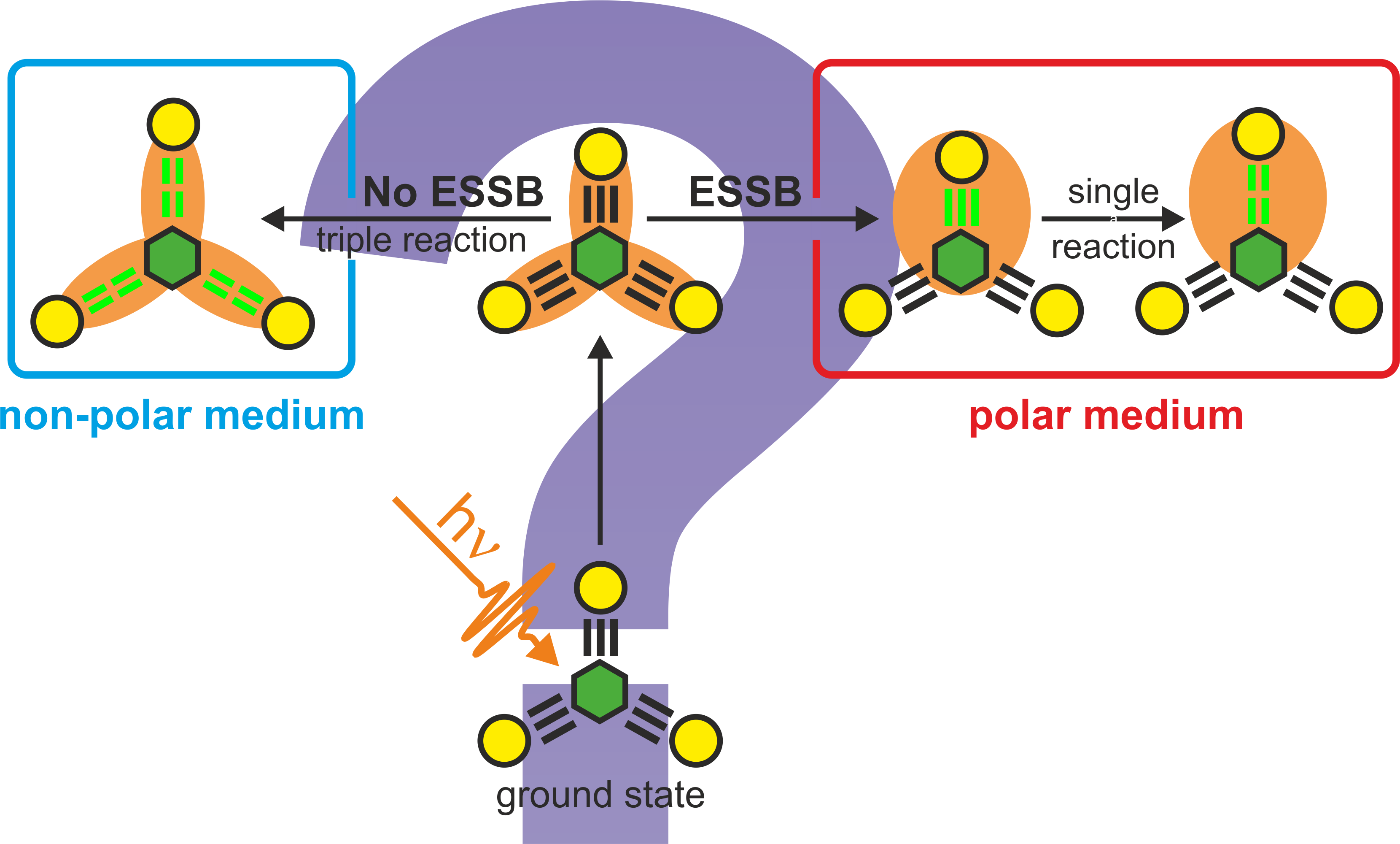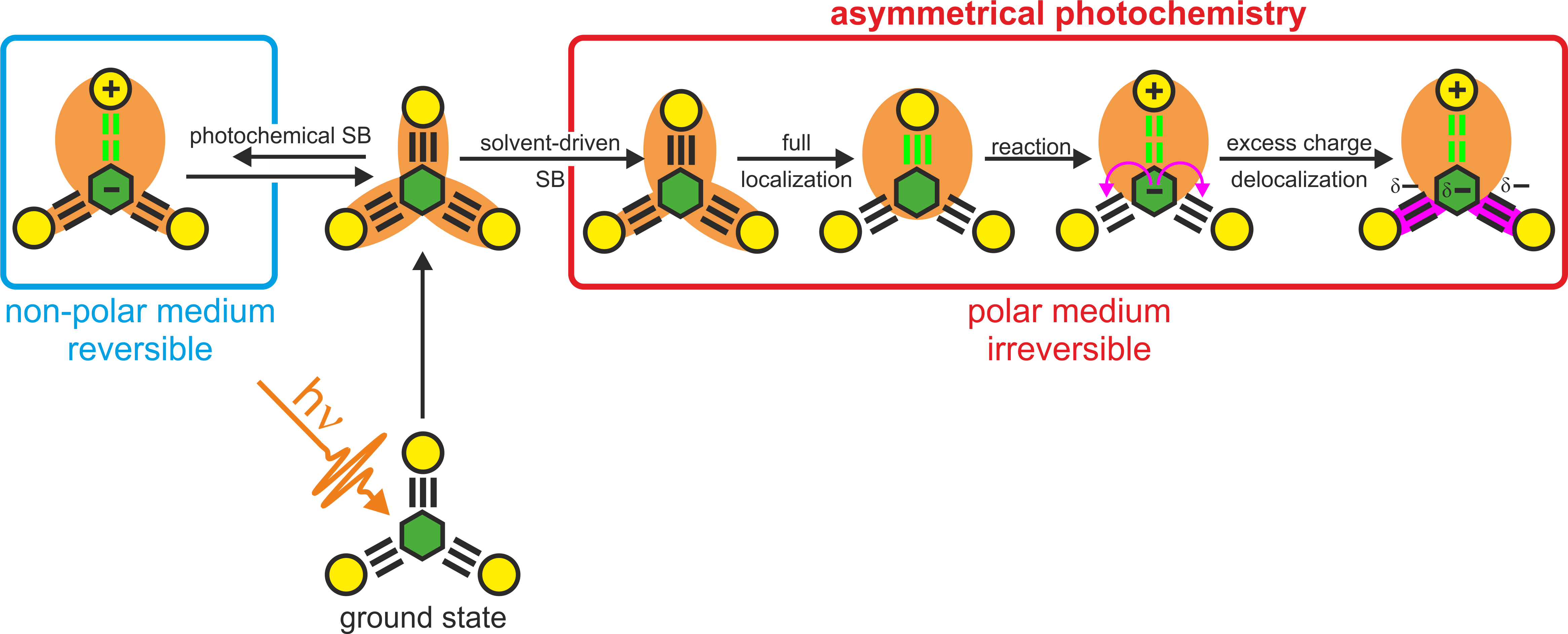 After we investigated all kinds of photophysical aspects of ESSB, the truly interesting chemical question emerged. How can symmetry breaking affect the ensuing intramolecular photochemistry? If excited state is so different in polar versus non-polar media, can we obtain different photoproducts by changing the solvent appropriately (Figure 1)? Moreover, since a symmetric excited state represents a coherent delocalized exciton, whereas the localized exciton is the one that underwent decoherence, it is a broad question of functional symmetry/asymmetry that boggles researchers’ minds today. With an array of state-of-the-art ultrafast multidimensional techniques, it is not a problem to demonstrate that coherence in the excited state exists and survives for sufficient time under appropriate circumstances, but can it be used to enhance chemical function? Can ESSB work as a switch between coherent and incoherent modalities?